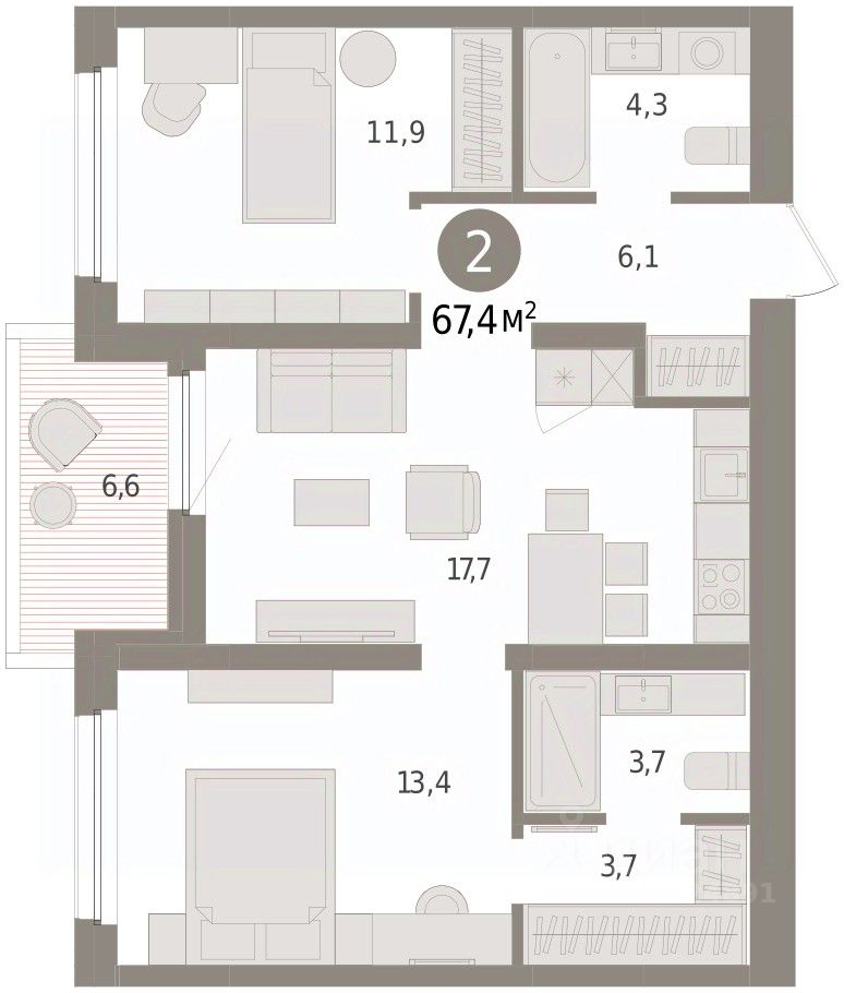 Квартира с кухней-гостиной и двумя спальнями в жилом районе ''Зарека''. Особенности планировки: второй санузел, гардеробная, мастер-спальня, предчистовая отделка, разнесённые спальни, терраса на крыше. О доме Замкнутый квартал высотой 8 этажей с 16-ти этажной башней-доминантой и двором на стилобате двухуровневого паркинга.