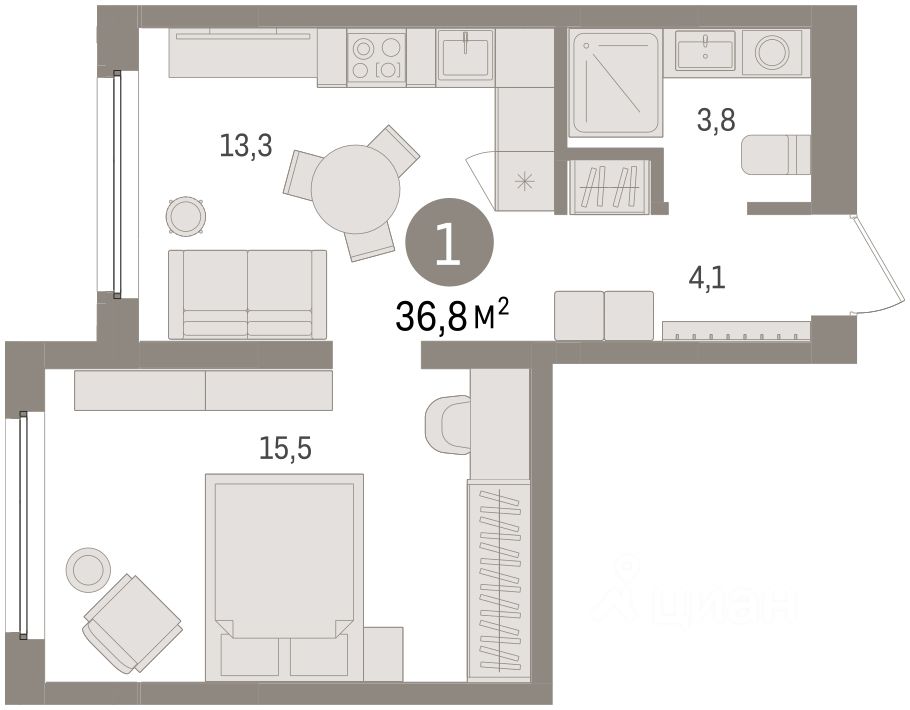 Квартира с кухней-гостиной и одной спальней в жилом районе ''Зарека''. Особенности планировки: предчистовая отделка. О доме Замкнутый квартал высотой 8 этажей с 16-ти этажной башней-доминантой и двором на стилобате двухуровневого паркинга.