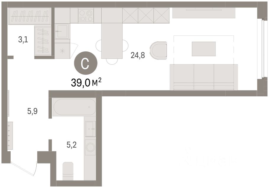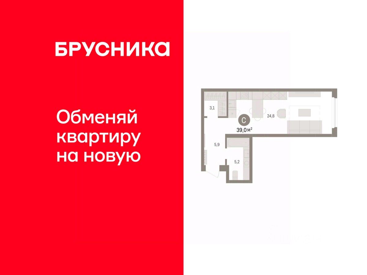 Студия в жилом районе ''Зарека''. Особенности планировки: гардеробная, предчистовая отделка. О доме Замкнутый квартал высотой 8 этажей с 16-ти этажной башней-доминантой и двором на стилобате двухуровневого паркинга.