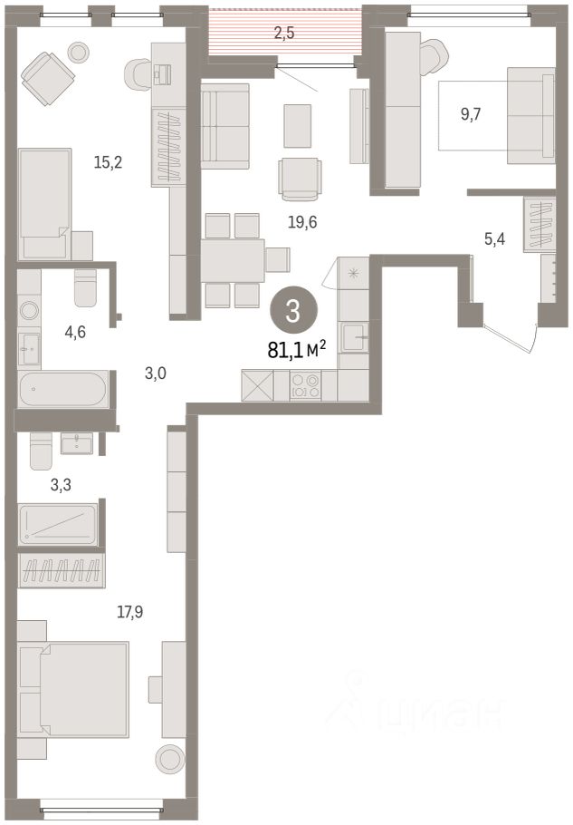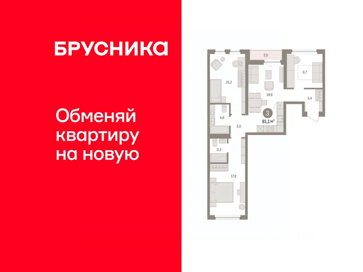 Квартира с кухней-гостиной и тремя спальнями в жилом районе ''Зарека''. Особенности планировки: вид во двор, второй санузел, лоджия, мастер-спальня, окна на две стороны, предчистовая отделка, рабочий кабинет, разнесённые спальни.