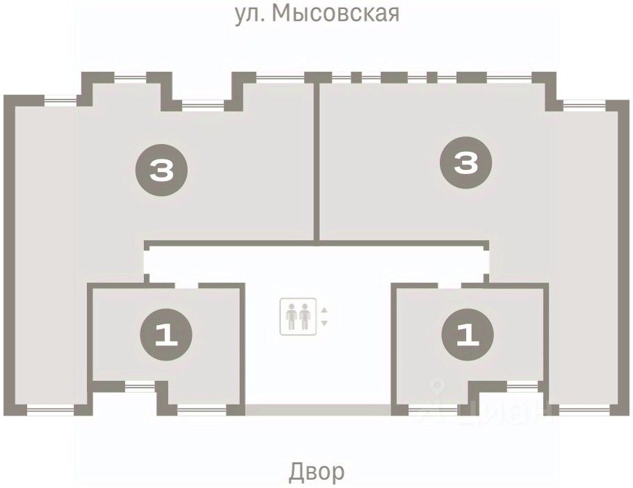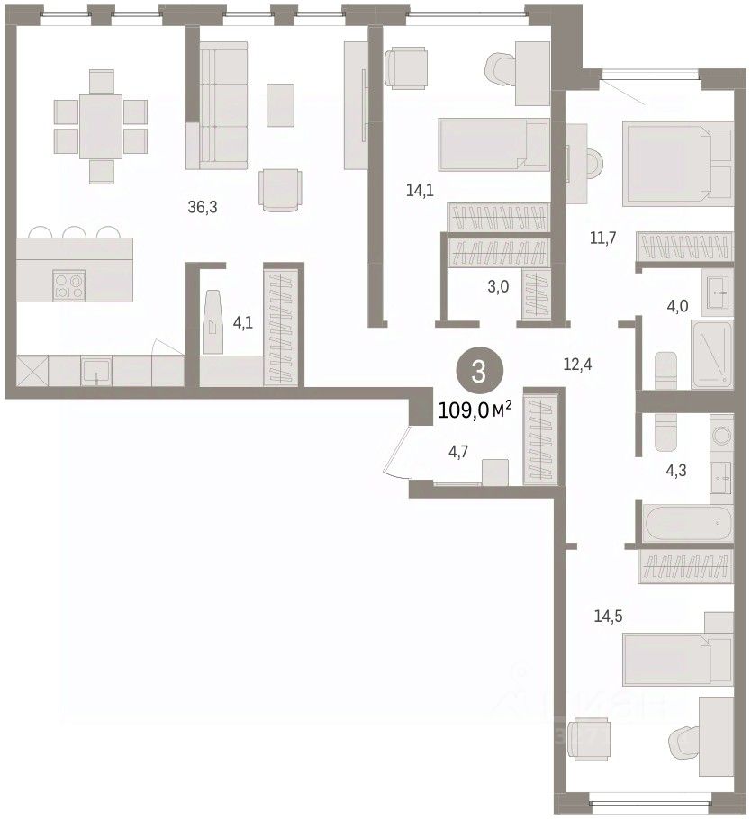 Квартира с кухней-гостиной и тремя спальнями в жилом районе ''Зарека''. Особенности планировки: вид во двор, второй санузел, гардеробная, мастер-спальня, окна в пол, окна на две стороны, постирочная, предчистовая отделка, разнесённые спальни.