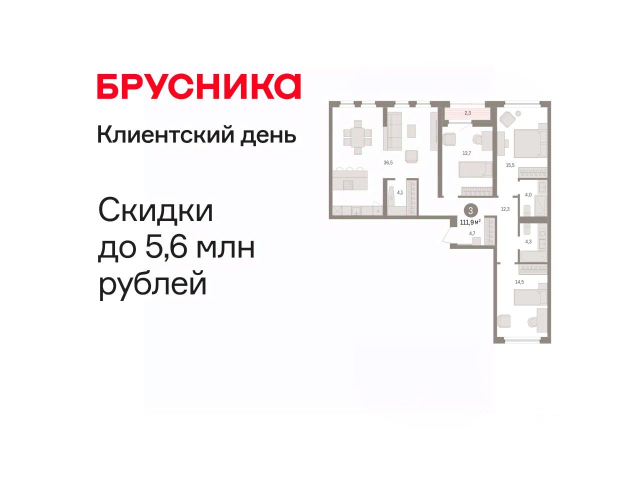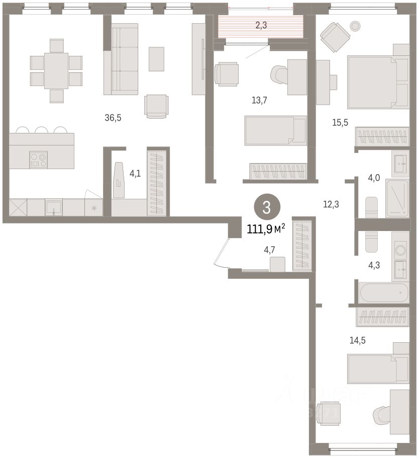 Трехкомнатная квартира от застройщика с предчистовой отделкой в ЖК ''Зарека'' на 4 этаже. Общая площадь: 111.9 кв.м. Высота потолков 2.7 м.