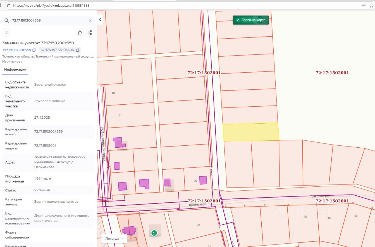 - адрес (местоположение) Тюменская область, Тюменский муниципальный округ, д. Нариманова, - кадастровый номер 72:17:1502001:559, - площадь 1 564 кв.м, - разрешенное использование для индивидуального жилищного строительства, - категория земель земли населенных пунктов, - территориальная зона зона застройки индивидуальными жилыми домами (Ж1)
