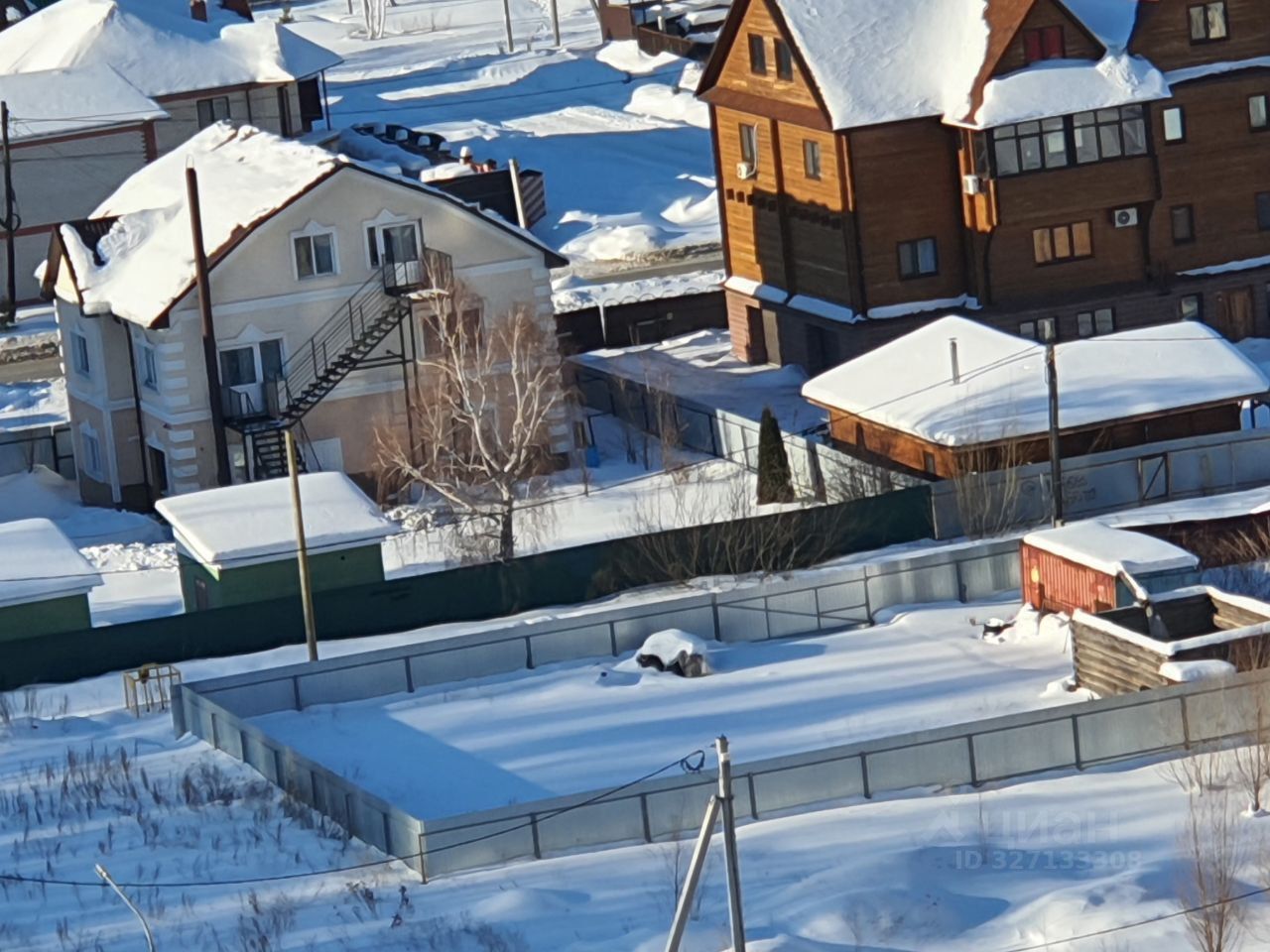 Участок высокий, ровный, огорожен по периметру. На участке находится строительный вагончик, сруб 64 под баню на фундаменте, скважина, насаждения.
