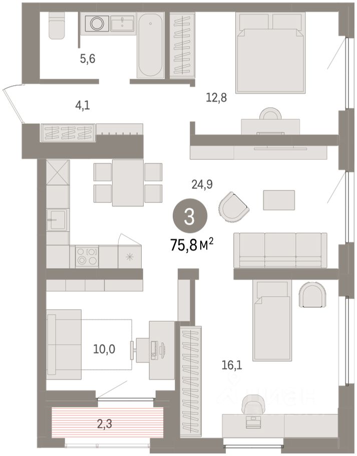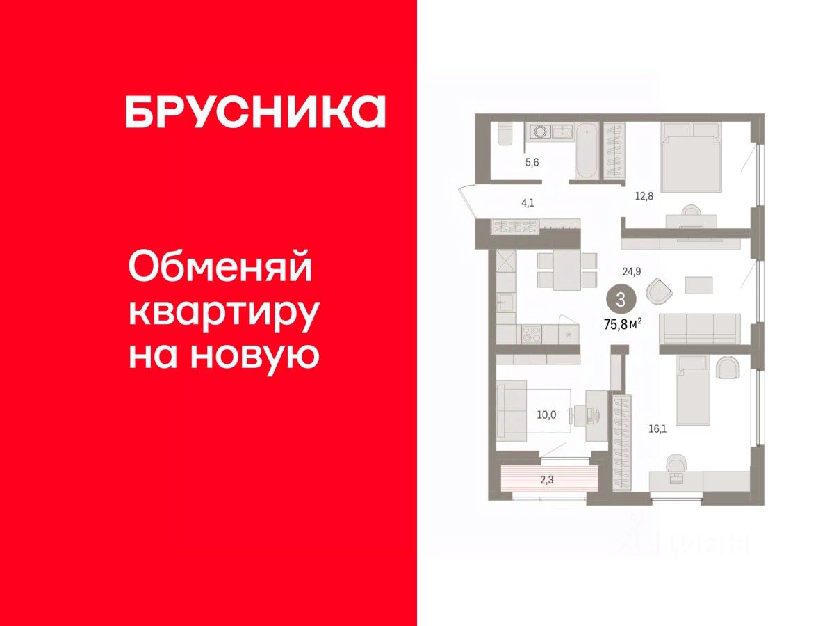 Квартира с кухней-гостиной и тремя спальнями в жилом районе ''Зарека''. Особенности планировки: лоджия, окна в пол, предчистовая отделка, разнесённые спальни. О доме Замкнутый квартал высотой 8 этажей с 16-ти этажной башней-доминантой и двором на стилобате двухуровневого паркинга.