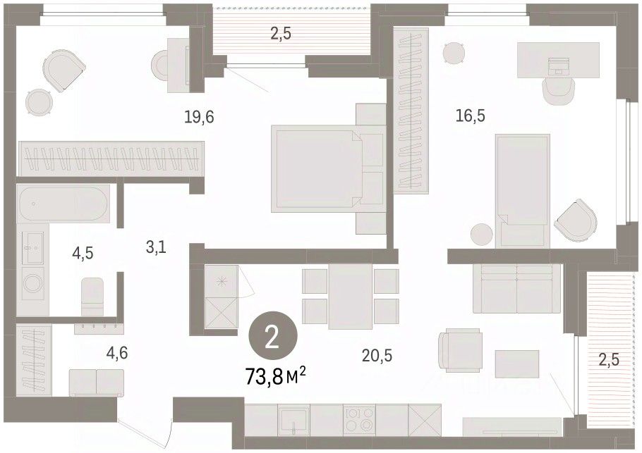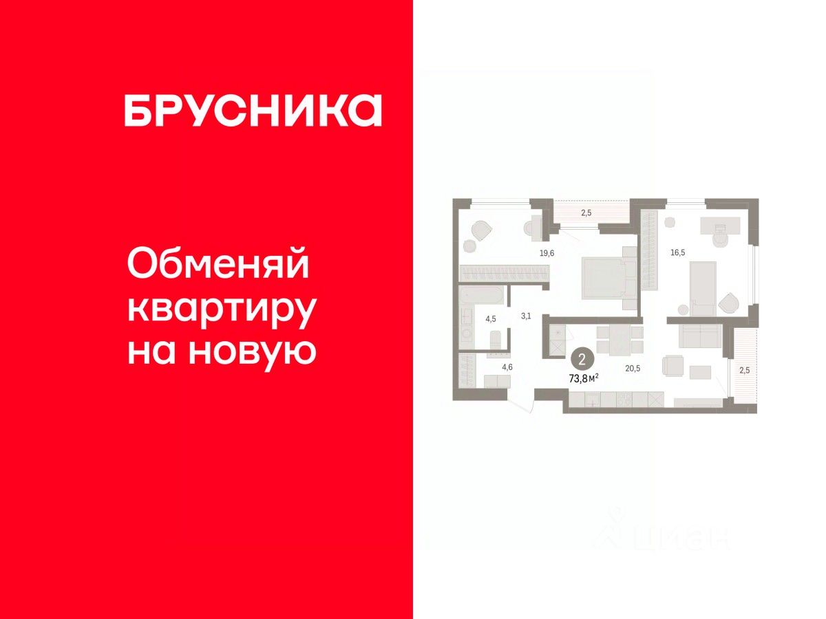 Квартира с кухней-гостиной и двумя спальнями в жилом районе ''Зарека''. Особенности планировки: лоджия, предчистовая отделка, разнесённые спальни. О доме Замкнутый квартал высотой 8 этажей с 16-ти этажной башней-доминантой и двором на стилобате двухуровневого паркинга.