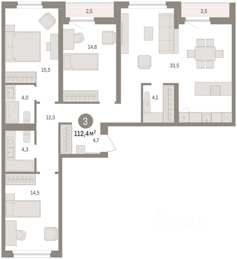 Трехкомнатная квартира от застройщика с предчистовой отделкой в ЖК ''Зарека'' на 8 этаже. Общая площадь: 112.36 кв.м. Высота потолков 2.7 м.