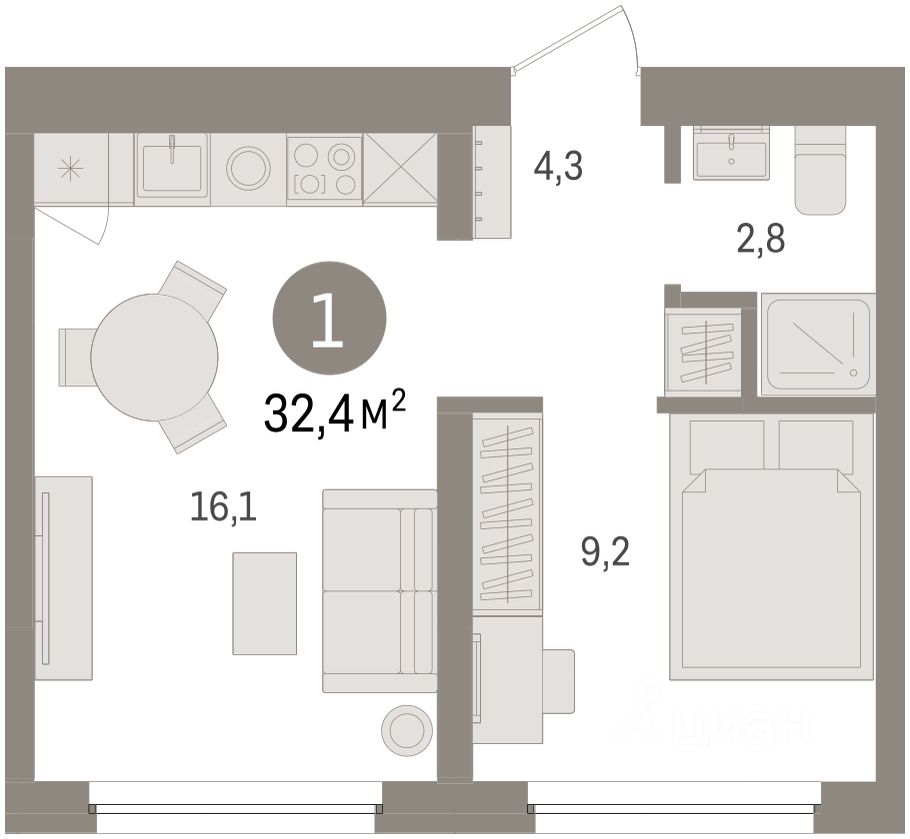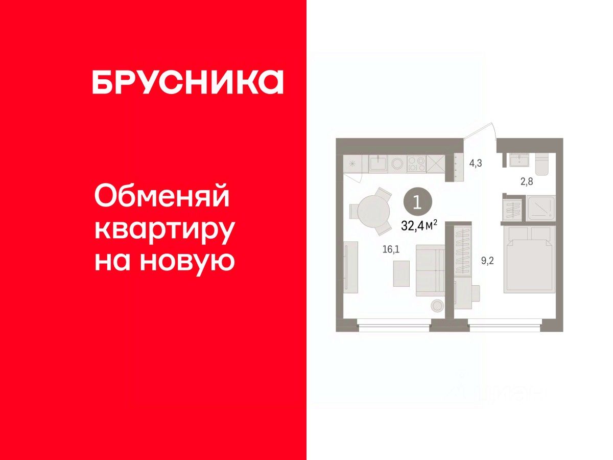 1-комн. квартира с предчистовой отделкой в ЖК ''Зарека'' на 3 этаже. Общая площадь: 32.42 кв.м., жилая: 9.2 кв.м., площадь просторной кухни-гостиной: 16.1 кв.м. Все окна выходят на одну сторону. В квартире один совмещенный санузел. Высота потолков 2.7 м.
