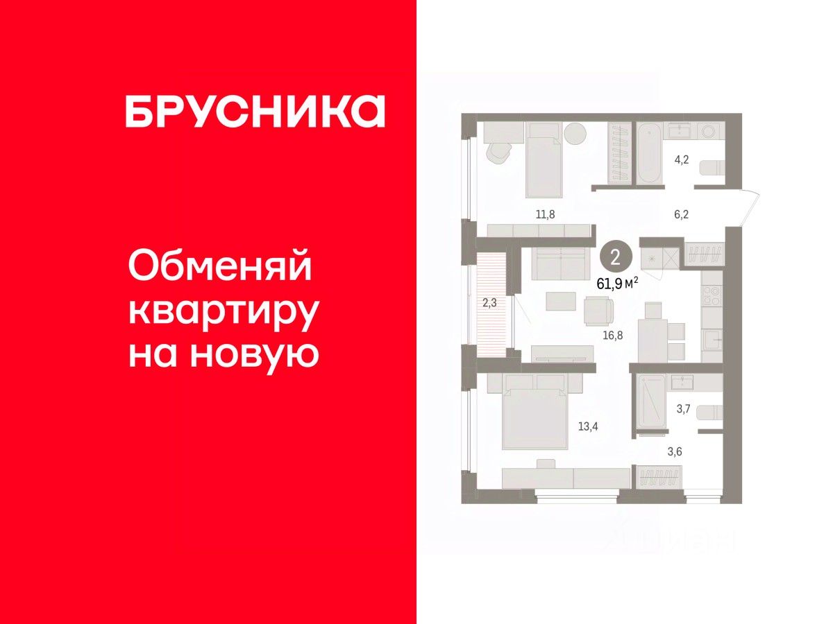 Квартира с кухней-гостиной и двумя спальнями в жилом районе ''Зарека''. Особенности планировки: второй санузел, гардеробная, лоджия, мастер-спальня, предчистовая отделка, разнесённые спальни. О доме Замкнутый квартал высотой 8 этажей с 16-ти этажной башней-доминантой и двором на стилобате двухуровневого паркинга.