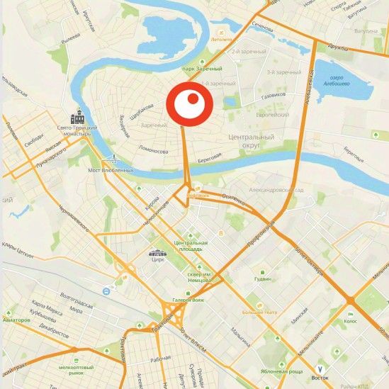 На планировочную структуру ''Зареки'' повлияла близость к автомобильному мосту Челюскинцев. Мы расположили жилые здания так, чтобы они постепенно удалялись от проезжей части. Приём напоминает лесенку: чем сильнее мост возвышается над участком застройки, тем дальше по отношению к нему стоят дома. Этот ступенчатый сдвиг позволил нам сформировать буфер между кварталами и оживлённой магистралью. Мы намерены высадить здесь высокие деревья и создать дополнительную защиту от дорожных шума и пыли.