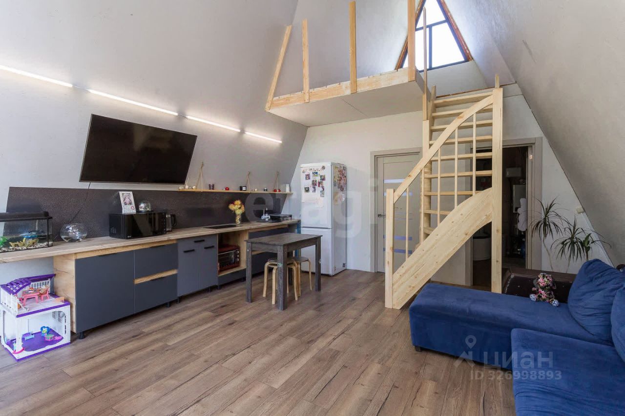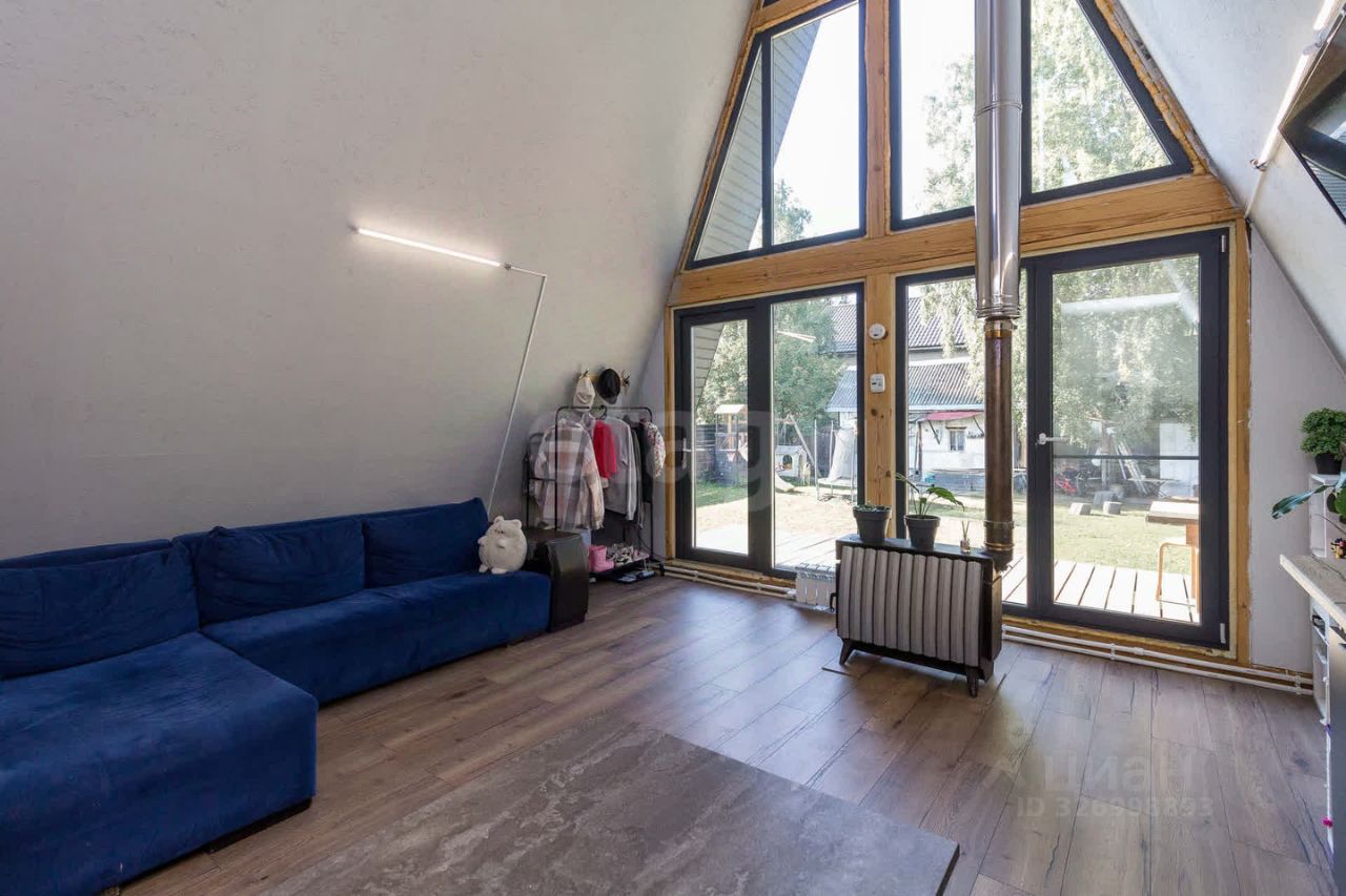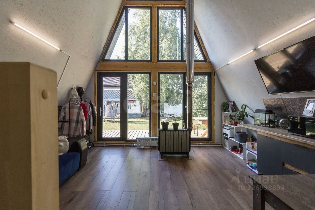 Дом выполнeнный в стилe А-фрейм. На первом этаже просторная кухня - гостиная, детская комната и сан узел. На втором этаже тоже комната, пирила уже доделаны (стоит кровать).