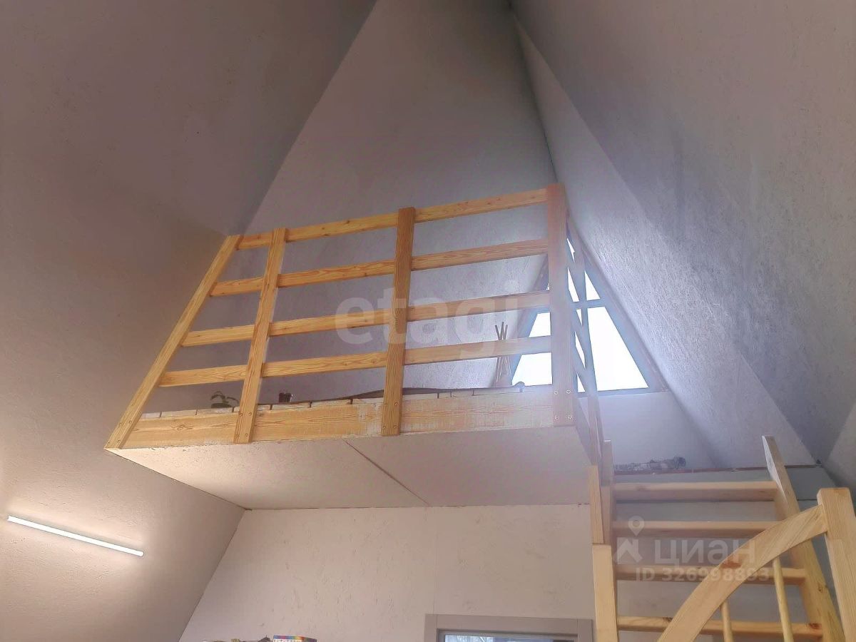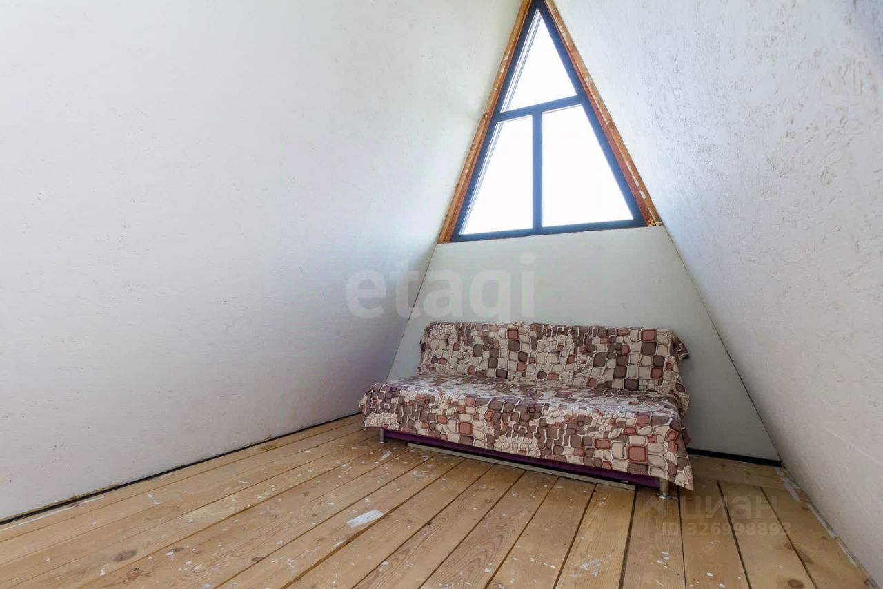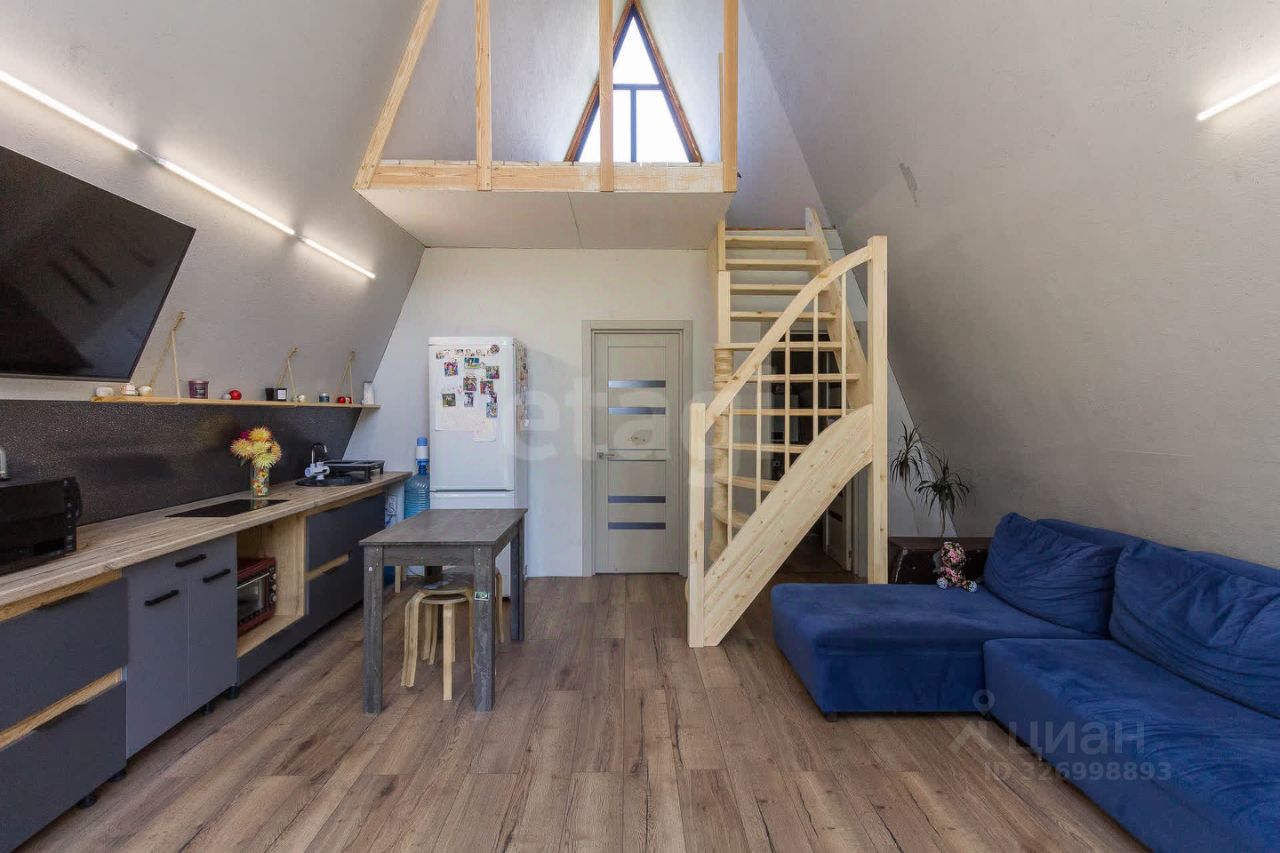 Дом выполнeнный в стилe А-фрейм. На первом этаже просторная кухня - гостиная, детская комната и сан узел. На втором этаже тоже комната, пирила уже доделаны (стоит кровать).