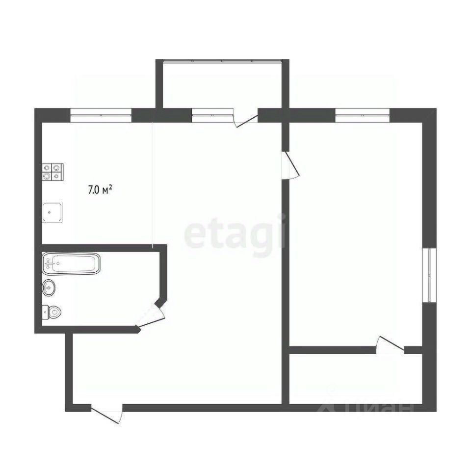 Пространство организовано рационально: объединенная кухня-гостиная увеличивает полезную площадь, а спальня расширена для большего комфорта.