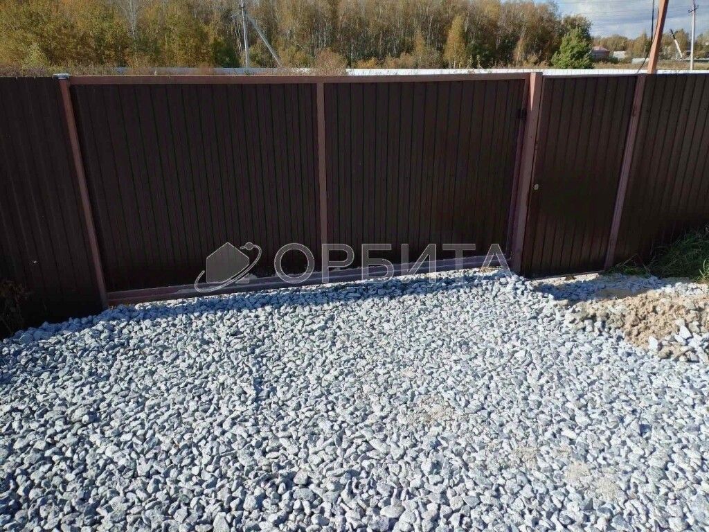 По периметру участка возведен капитальный забор высотой 2 метра из профнастила толщиной 0,4 мм в цвете ''шоколад''. Конструкция отличается повышенной надежностью: опоры выполнены из труб НКТ диаметром 73 мм со стенкой 5,5 мм, забетонированы на глубину 1,82 метра в лунки диаметром 300 мм с применением бетона марки B22,5 (M300). Прожилины изготовлены из профильной трубы 40х20 мм с толщиной стенки 2 мм. Ворота откатного типа с рабочей шириной 4 метра и высотой 2 метра, усилены опорами из профильной трубы 80х80х3 мм.