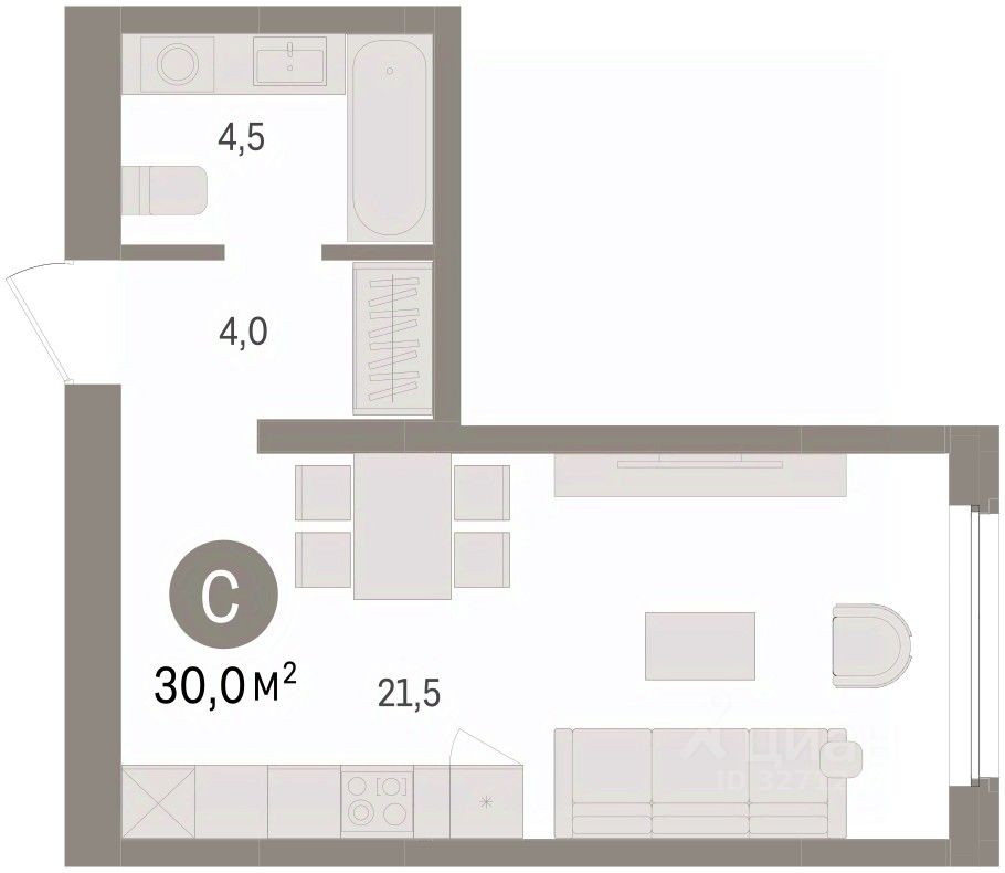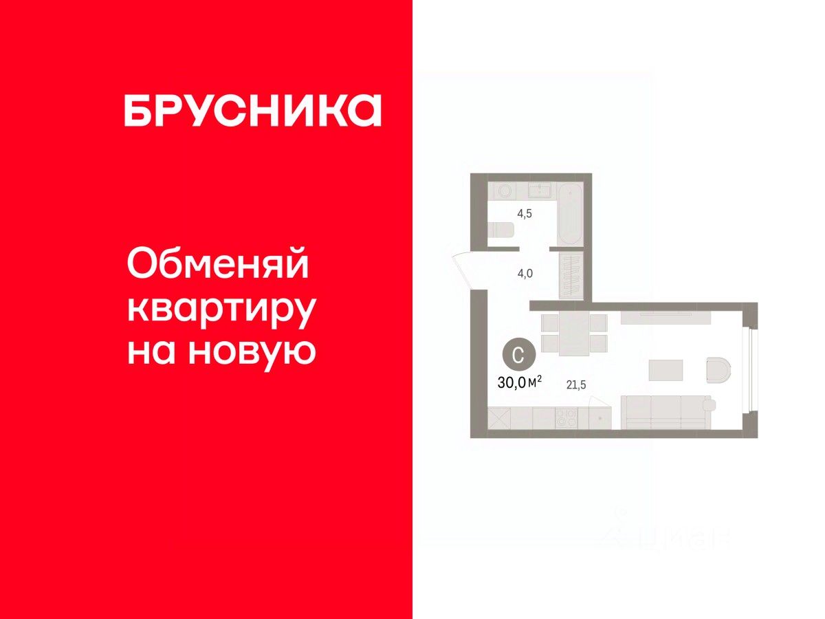 1-комн. студия с предчистовой отделкой в ЖК ''Зарека'' на 4 этаже. Общая площадь: 30 кв.м., площадь гостиной 21.5 кв.м., из которых 5 кв.м. выделено под кухонную зону. Все окна выходят на одну сторону. В квартире один совмещенный санузел. Высота потолков 2.7 м.