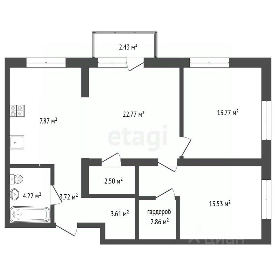 Продается двухкомнатная квартира площадью 77.23м² (включая площадь балкона 2,43м2) на 3 этаже, 7этажного нового дома в ЖК ''Зарека''. Сдача дома 4кв.2026г. Квартира представляет собой выгодное и продуманное предложение на первичном рынке. Планировка квартиры была изначально разработана для комфортного проживания: эффективное зонирование разделяет приватную спальную зону и общее пространство, обеспечивая рациональное использование площади и удобные варианты для расстановки мебели.