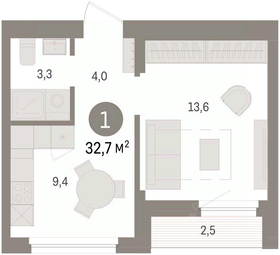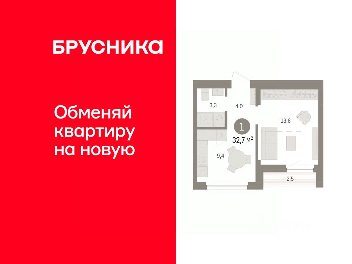Однокомнатная квартира от застройщика с предчистовой отделкой в ЖК ''Зарека'' на 4 этаже. Общая площадь: 32.51 кв.м. Высота потолков 2.7 м.