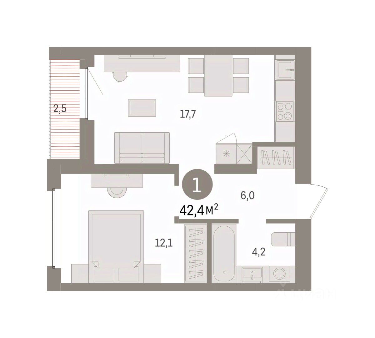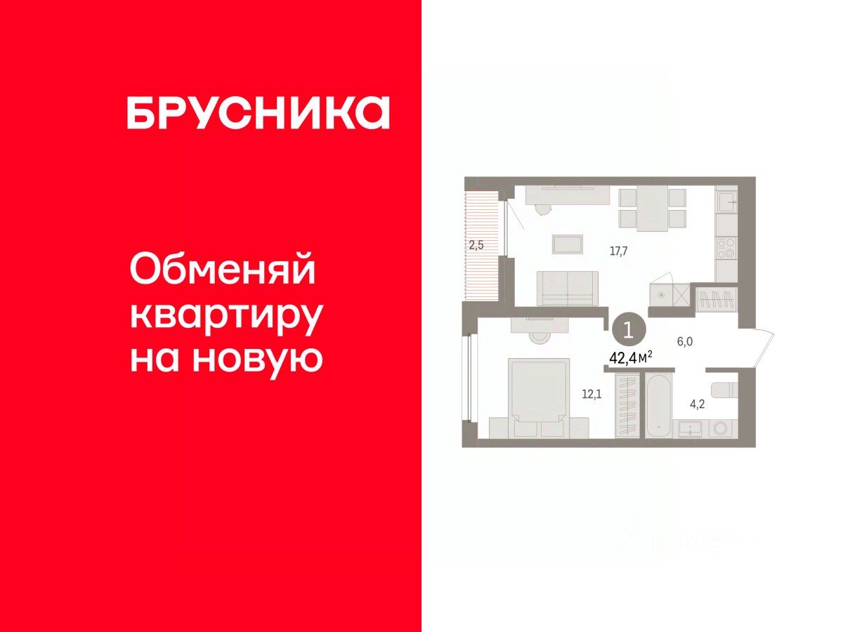 1-комн. квартира с предчистовой отделкой в ЖК ''Зарека'' на 8 этаже. Общая площадь: 42.42 кв.м. Высота потолков 2.7 м.
