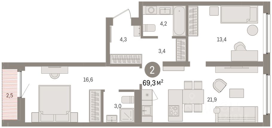 2-комн. квартира с предчистовой отделкой в ЖК ''Зарека'' на 5 этаже. Общая площадь: 69.26 кв.м. Высота потолков 2.7 м.
