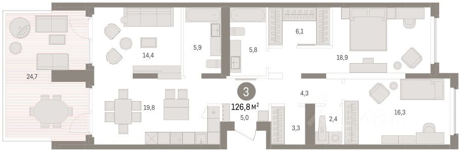 Квартира с кухней-гостиной и двумя спальнями в жилом районе ''Зарека''. Особенности планировки: вид во двор, второй санузел, гардеробная, лоджия, окна на две стороны, постирочная, разнесённые спальни, свободная планировка. О доме Замкнутый квартал высотой 8 этажей с 16-ти этажной башней-доминантой и двором на стилобате двухуровневого паркинга.