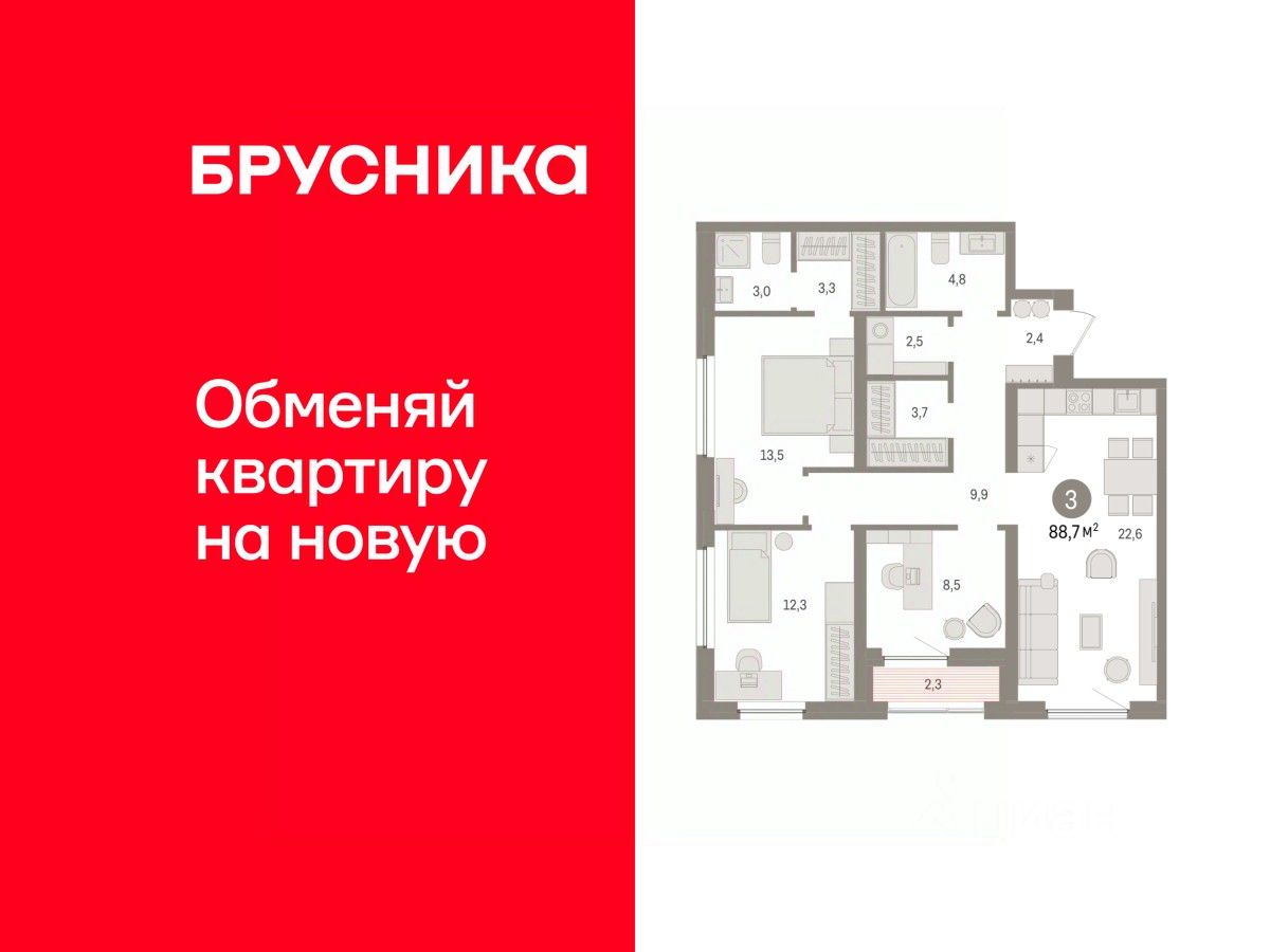 Квартира с кухней-гостиной и тремя спальнями в жилом районе ''Зарека''. Особенности планировки: вид во двор, второй санузел, гардеробная, лоджия, мастер-спальня, окна в пол, постирочная, предчистовая отделка, разнесённые спальни. О доме Замкнутый квартал высотой 8 этажей с 16-ти этажной башней-доминантой и двором на стилобате двухуровневого паркинга.
