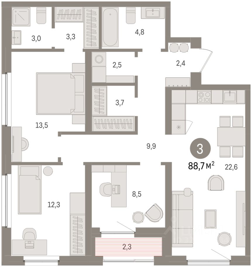 Квартира с кухней-гостиной и тремя спальнями в жилом районе ''Зарека''. Особенности планировки: вид во двор, второй санузел, гардеробная, лоджия, мастер-спальня, окна в пол, постирочная, предчистовая отделка, разнесённые спальни.