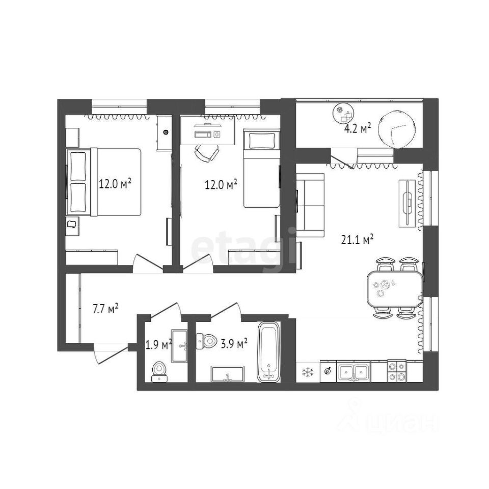 Уважаемые покупатели, продаётся квартира формата 2+ в жилом комплексе ''Андерсен Парк'', район Тюменской слободы. Кухня-гостиная правильной квадратной формы, укомплектованная кухонным гарнитуром, встроенной техникой (варочная поверхность, духовой шкаф, вытяжка, холодильник, микроволновая печь),а также в гарнитуре предусмотрено место под посудомоечную машину. Стильный диван, и обеденная зона. В прихожей установлен вместительный шкаф-купе. Есть отдельное помещение-постирочная, где расположена стиральная машинка. Две комнаты, одну используют под спальню, вторую под кабинет. Совмещенный сан.узел с акриловой ванной, навесной тумбой с зеркалом с подсветкой, инсталляцией. В квартире современный ремонт, с использованием качественных, дорогих отделочных материалов.