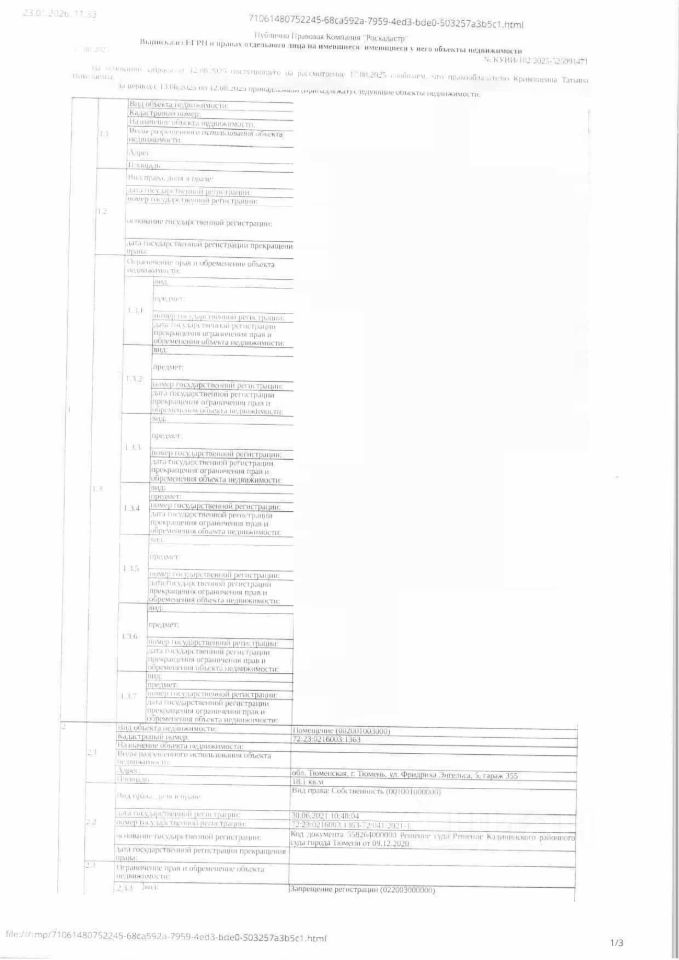 Должник: Кривошеина Т.Н., собственник: Кривошеина Т.Н. Лот: Нежилое помещение (гараж), площадь 18,1 кв.м, кадастровый номер: 72:23:0216003:1363, г. Тюмень, ул. Фридриха Энгельса, д.5, гараж 355, н/ц: 212900 р., з-к: 31935 р., код: 0001, рег. 72-011251