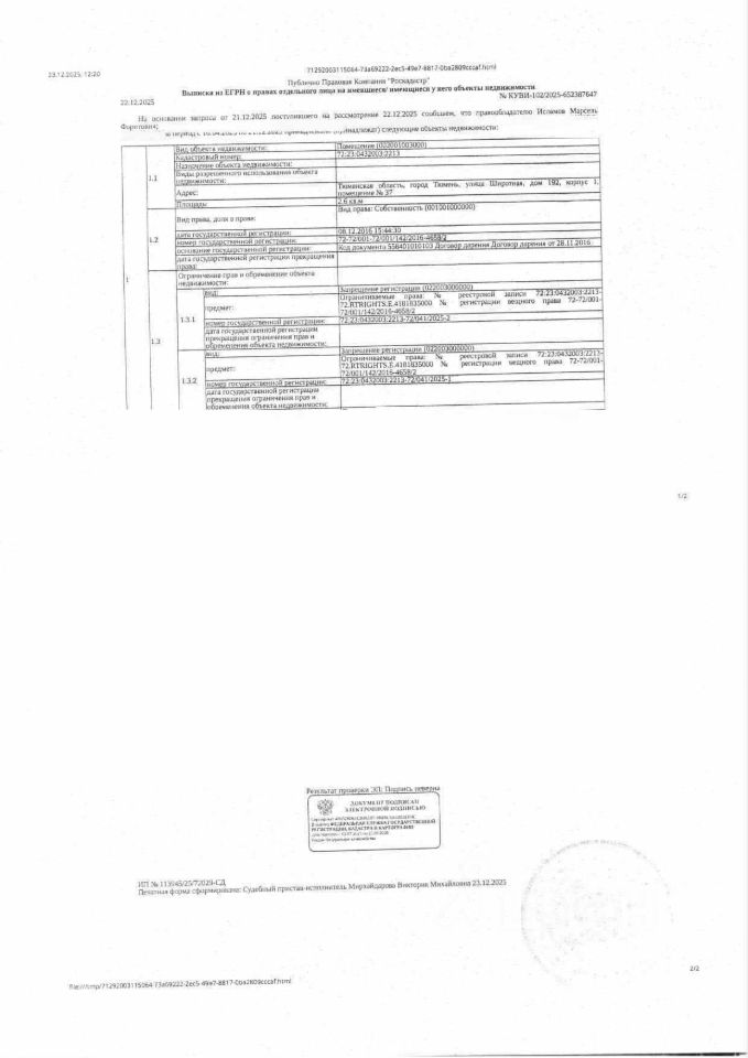 Должник: Исламов М.Ф., собственник: Исламов М.Ф. Лот: Нежилое помещение, площадь 2,6 кв.м., кадастровый номер: 72:23:0432003:2213, г. Тюмень, ул. Широтная, д. 192 корп.1, пом. 37, н/ц: 311900 р., з-к: 46785 р., код: 0001, рег. 72-011131