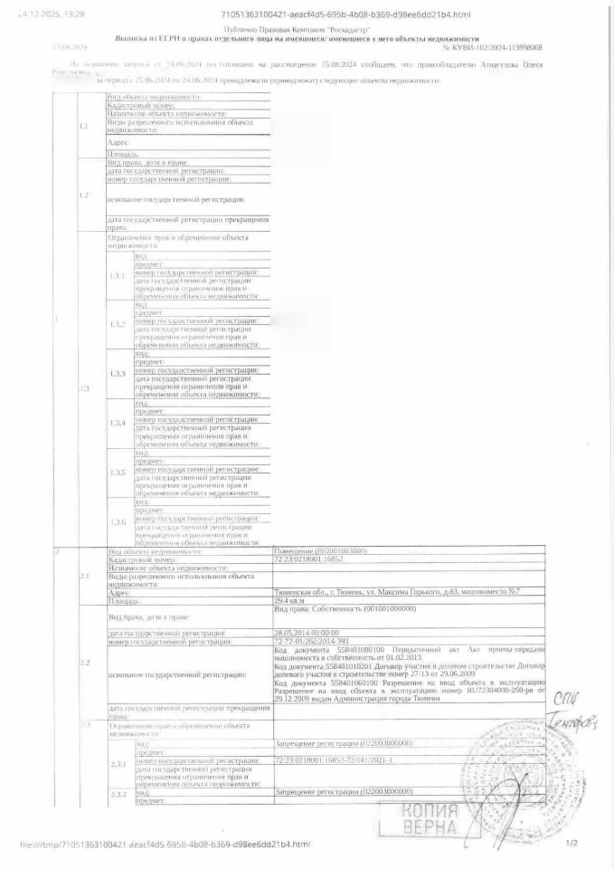 Должник: ИП Атнагулова О.Р., собственник: Атнагулова О.Р. Лот: Нежилое помещение, площадь 29,4 кв.м., кадастровый номер: 72:23:0218001:16852, г. Тюмень, ул. Максима Горького, д. 83, машиноместо 7, н/ц: 1015300 р., з-к: 152295 р., код: 0001, рег. 72-011193