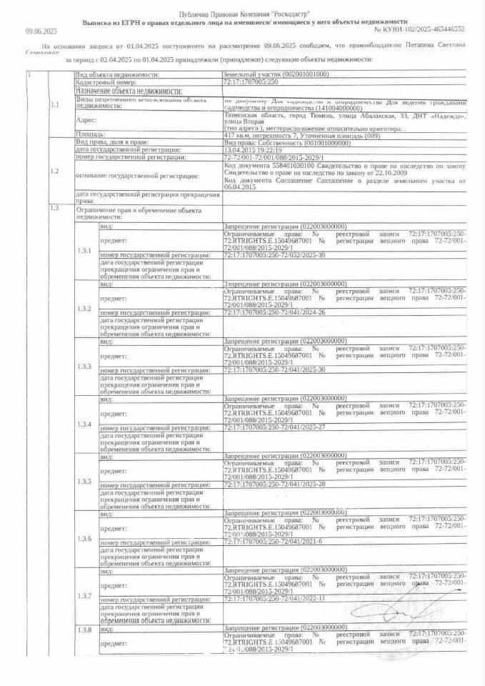 Должник: Потапова С.С., собственник: Потапова С.С. Лот: Земельный участок (земли населенных пунктов, для садоводства и огородничества), площадь 417 кв.м., кадастровый номер: 72:17:1707005:250, г. Тюмень, ул. Абалакская, д. 33, ДНТ ''Надежда'', ул. Вторая, н/ц: 1331000 р., з-к: 199650 р., код: 0001, рег. 72-011182