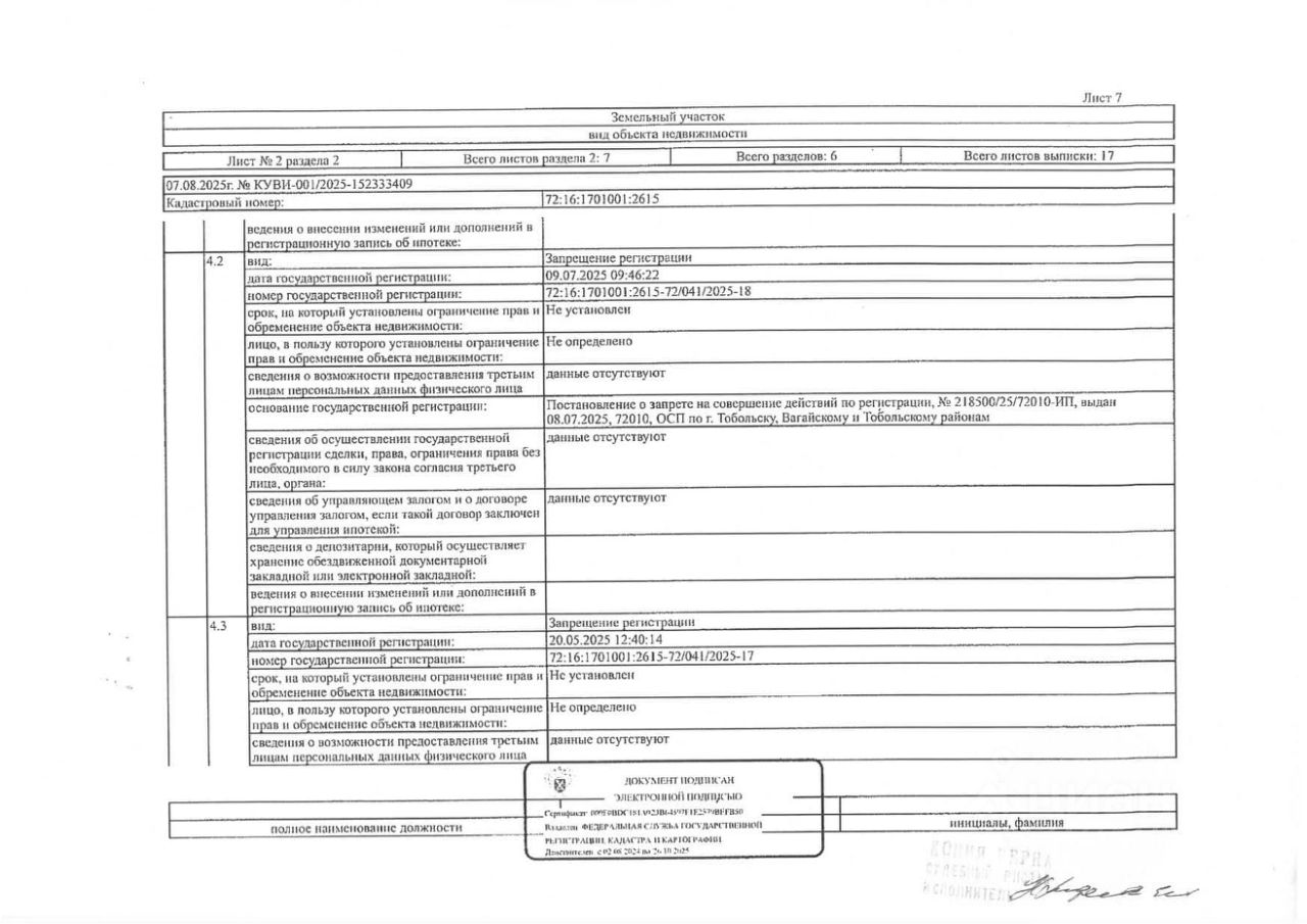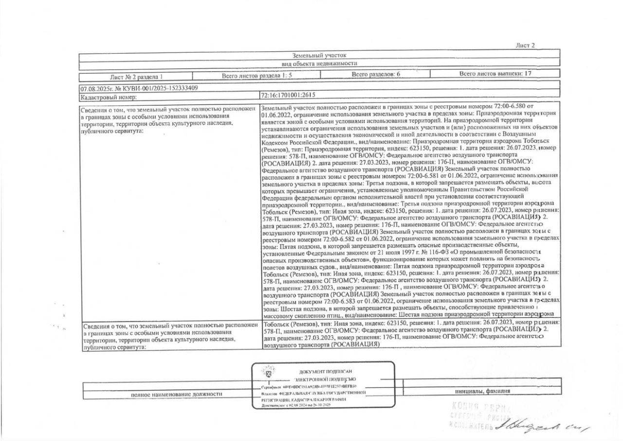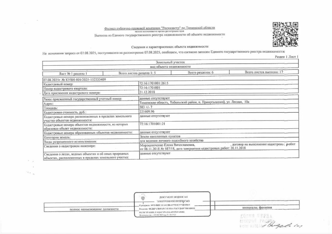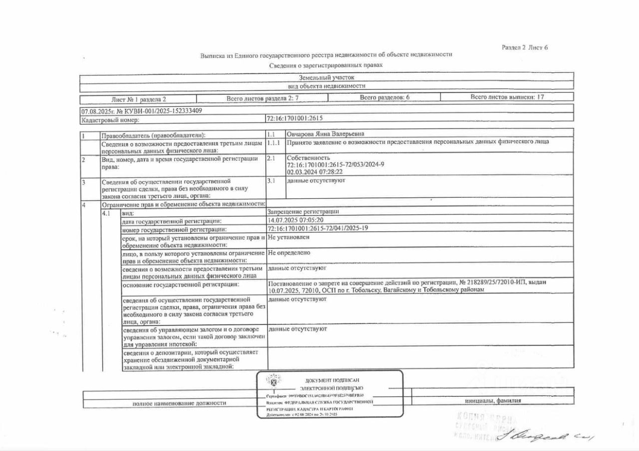 Должник: Овчарова Я.В., собственник: Овчарова Я.В. Лот: Земельный участок (земли населенных пунктов, для ведения личного подсобного хозяйства), площадь 583 кв.м., кадастровый номер: 72:16:1701001:2615, Тобольский р-н, п. Прииртышский, ул. Лесная, 10А, н/ц: 569000 р., з-к: 85350 р., код: 0001, рег. 72-011288