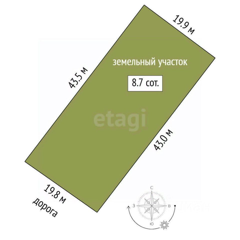 Предлагаем вам участок площадью 8,7 соток с назначением для Индивидуального Жилищного Строительства. Правильная форма участка (ширина 20 метров и длина 43,7 метра) предоставляет вам все возможности для реализации ваших архитектурных идей. Здесь вы сможете построить уютный дом и разместить дополнительные постройки, а также создать прекрасную придомовую территорию для отдыха и семейных встреч.