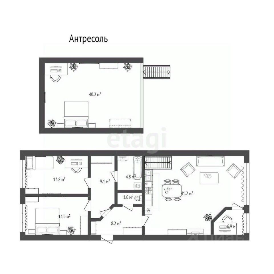 Основной особенностью данной квартиры является наличие антресольного этажа, где располагается пространство площадью 40 м2, не разделенное на зоны. Его назначение вы можете определить на свое усмотрение. Также антресоль позволяет создать объем в квартире, так как высота потолка в кухне-гостиной составляет 6м., на нижнем уровне - 2,85 м. Также предусмотрен второй свет, т.е. наличие дополнительных окон в верхнем ярусе.