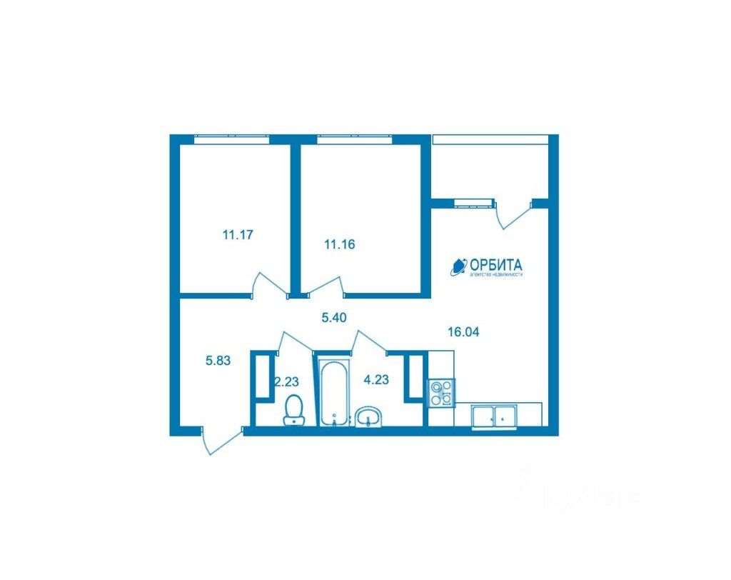 Общая площадь квартиры — 57,16 м², с учётом балкона — 59,69 м².