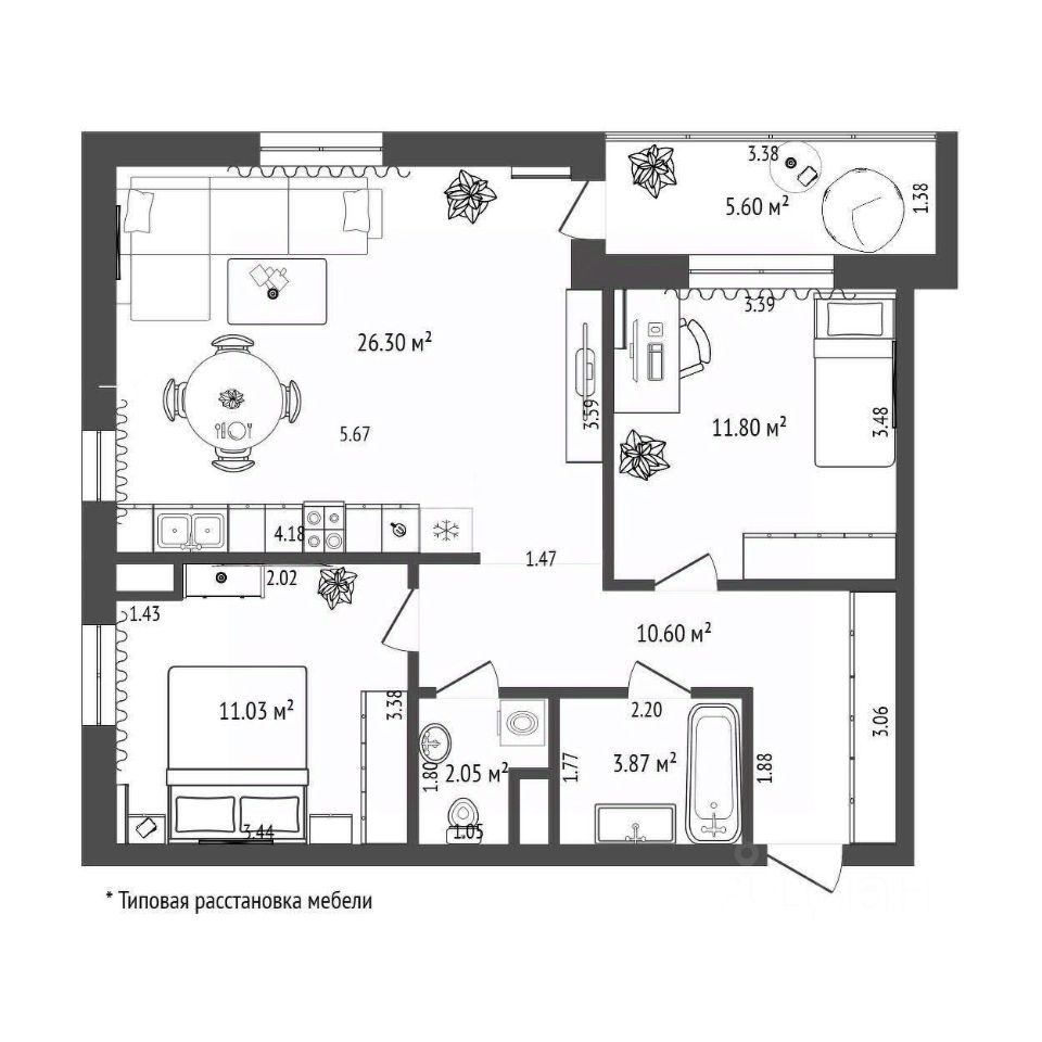 Продуманное пространство для жизни Сердце дома: Светлая кухня-гостиная, где утренний кофе у мойки у окна задает тон всему дню. Вся необходимая техника уже на месте. Оазисы спокойствия: Две уютные спальни с хорошим светом — место, где царит гармония и ничто не нарушает ваш отдых. Дополнительный бонус: Просторная лоджия с панорамным остеклением — идеальный уголок для зимнего сада или зоны релакса.