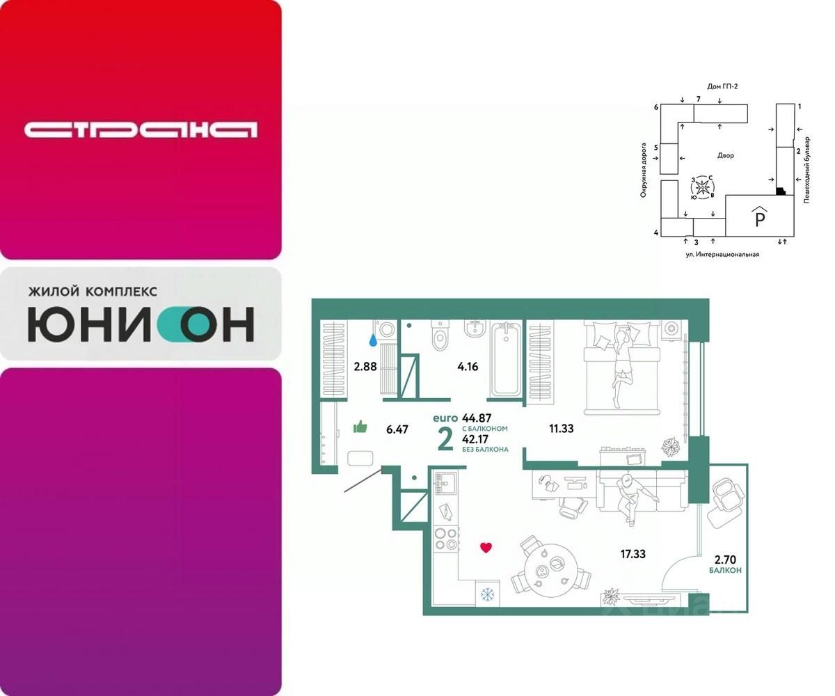 Продается 2комнатная квартира в новом ЖК ''Юнион''. Общая площадь квартиры 44,87 кв. м. Сдача — в 3 квартале 2024 года.