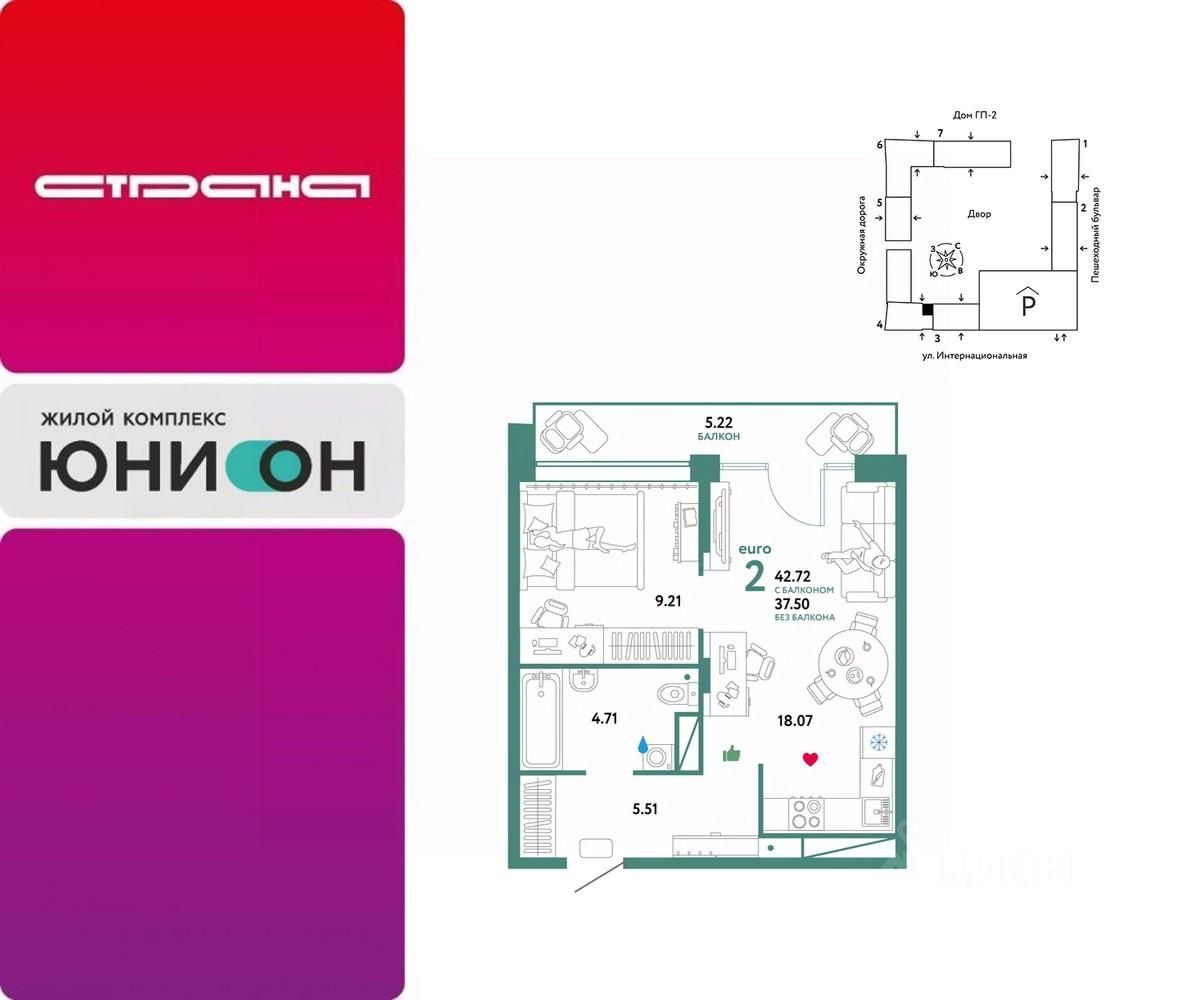 Продается 2комнатная квартира в новом ЖК ''Юнион''. Общая площадь квартиры 42,72 кв. м. Сдача — в 3 квартале 2024 года.