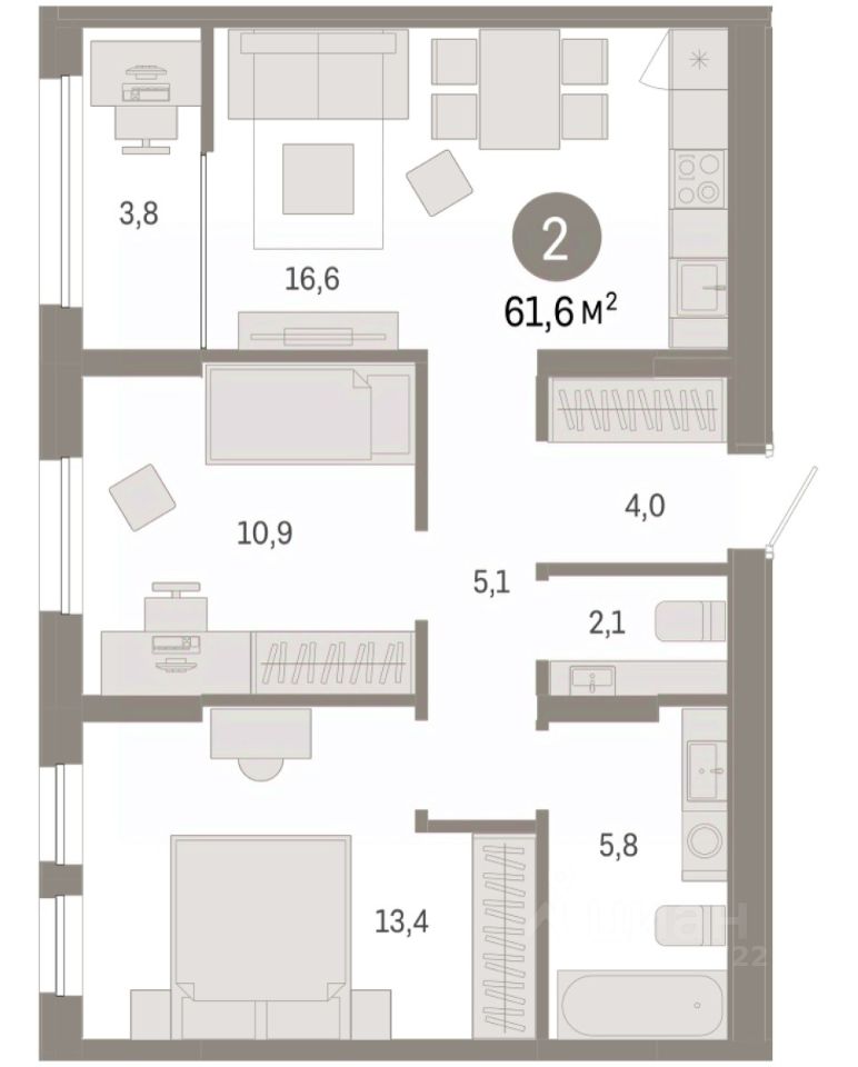 Просторная 2-комн. квартира с предчистовой отделкой в ЖК ''Республики 205'' на 16 этаже. Общая площадь: 61.64 кв.м., жилая: 24.3 кв.м., площадь просторной кухни-гостиной: 16.6 кв.м. Комнаты изолированные, все окна выходят на одну сторону. В квартире одна лоджия, один совмещенный и один раздельный санузел. Высота потолков 2.6 м.