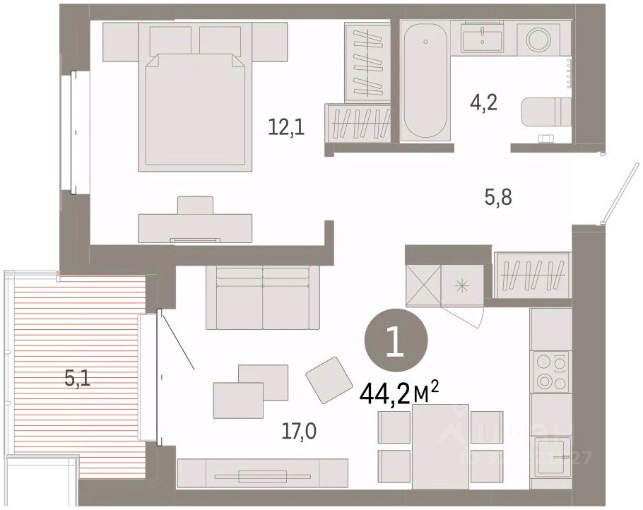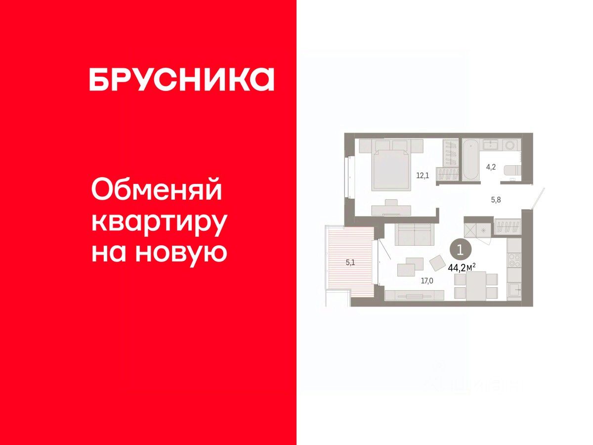 Квартира с кухней-гостиной и одной спальней в кварталах ''На Минской''. Особенности планировки: балкон, вид во двор, предчистовая отделка. квартиры в нашей базе: МНС02-Ж5.4.4.
