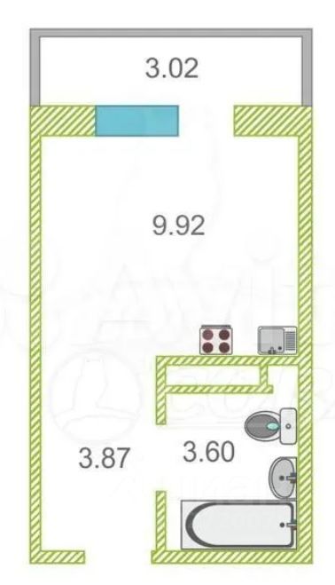 Холодильник, лоджия, кровать, кухонный уголок, ванна.