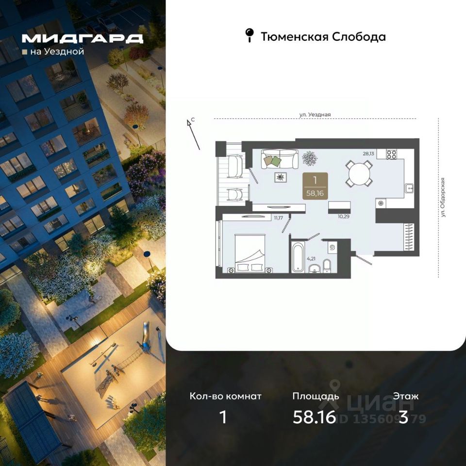 Однокомнатная квартира в ЖК ''Мидгард на Уездной'' на 3 этаже. Квартира без отделки, после оформления собственности можно делать ремонт. Общая площадь: 58.16 кв.м., жилая: 11.17 кв.м., площадь просторной кухни-столовой: 28.13 кв.м. Все окна выходят на одну сторону. В квартире одна лоджия, один совмещенный санузел. Высота потолков 2.72 м.
