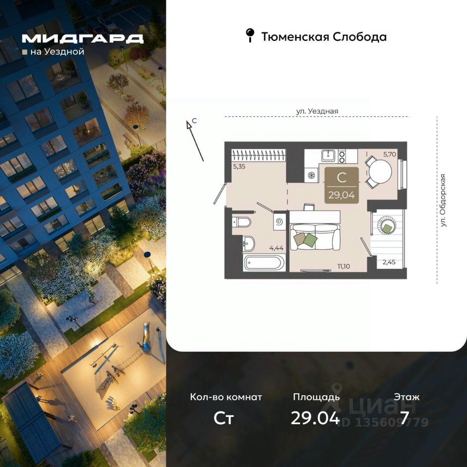 1-комн. квартира-студия в ЖК ''Мидгард на Уездной'' на 7 этаже. Квартира без отделки, полностью готова к ремонту. Общая площадь: 29.04 кв.м., площадь гостиной 16.8 кв.м., из которых 5.7 кв.м. выделено под кухонную зону. Все окна выходят на одну сторону. В квартире одна лоджия, один совмещенный санузел. Высота потолков 2.72 м.