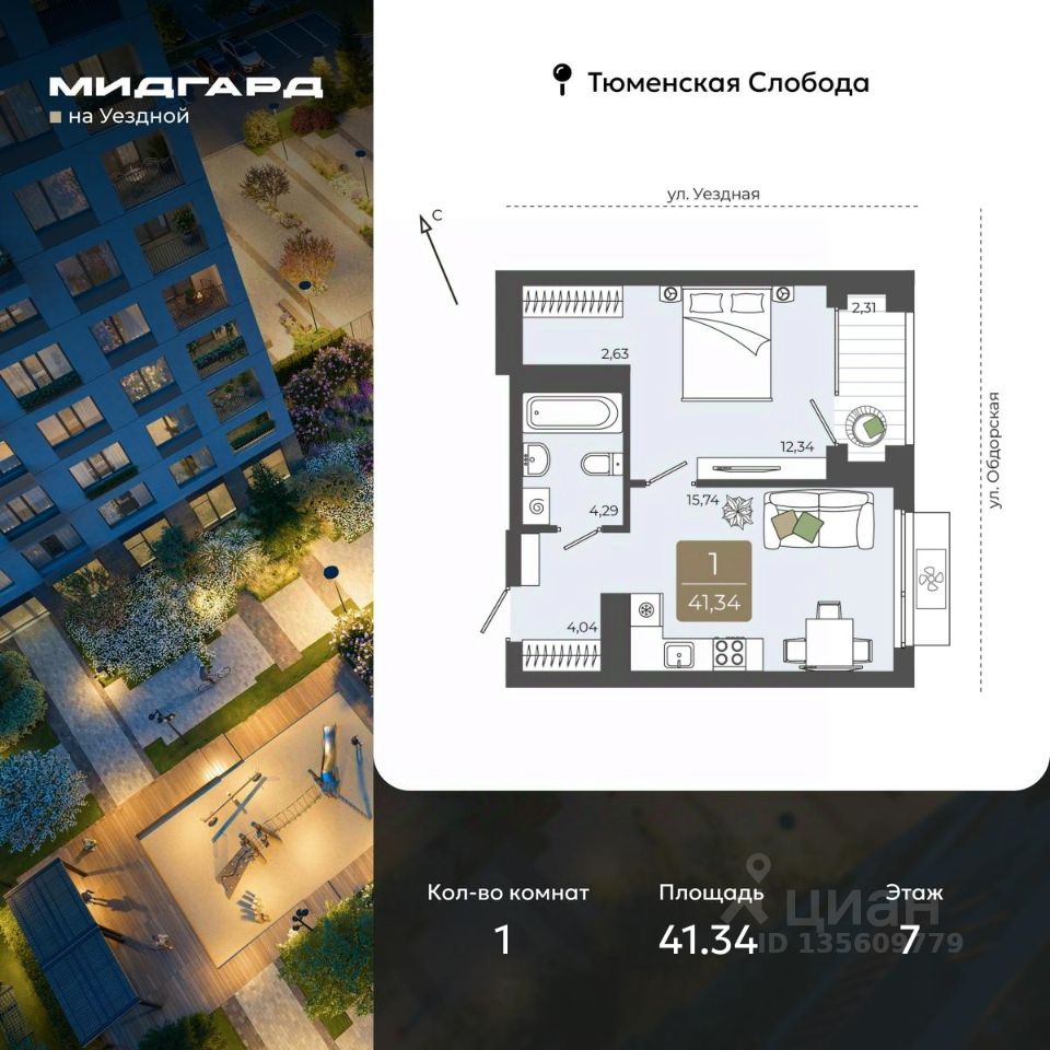 Просторная однокомнатная квартира в ЖК ''Мидгард на Уездной'' на 7 этаже. Квартира без отделки, новый собственник может сделать ремонт по индивидуальному дизайн-проекту. Общая площадь: 41.34 кв.м., жилая: 12.34 кв.м., площадь просторной кухни-столовой: 15.74 кв.м. Все окна выходят на одну сторону. В квартире одна лоджия, один совмещенный санузел. Высота потолков 2.72 м.