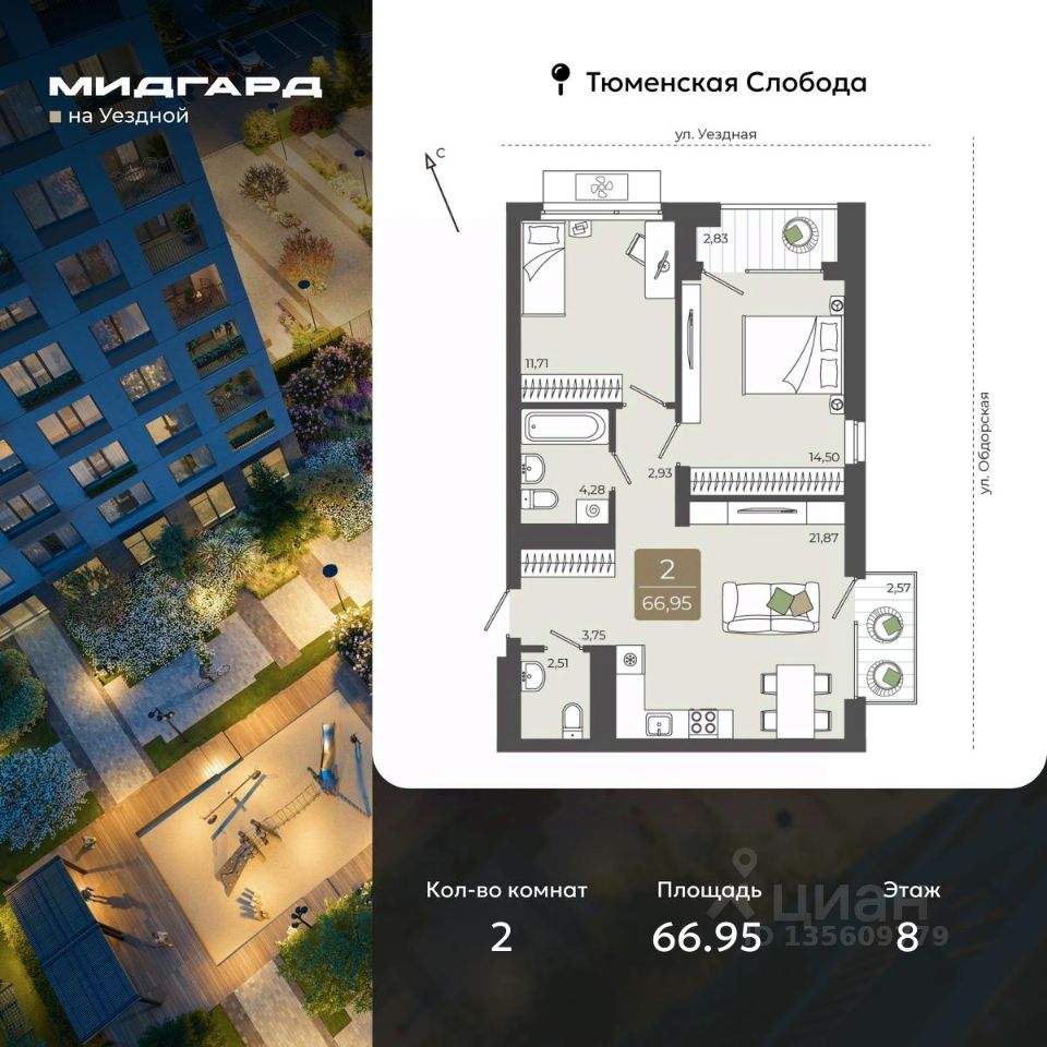 2-комн. квартира в ЖК ''Мидгард на Уездной'' на 8 этаже. Квартира без отделки, новый собственник может сделать ремонт по индивидуальному дизайн-проекту. Общая площадь: 66.95 кв.м., жилая: 26.21 кв.м., площадь просторной кухни-столовой: 21.87 кв.м. Квартира угловая, идеально подойдет любителям тишины и панорамных видов. В квартире одна лоджия, один совмещенный и один раздельный санузел. Высота потолков 2.72 м.
