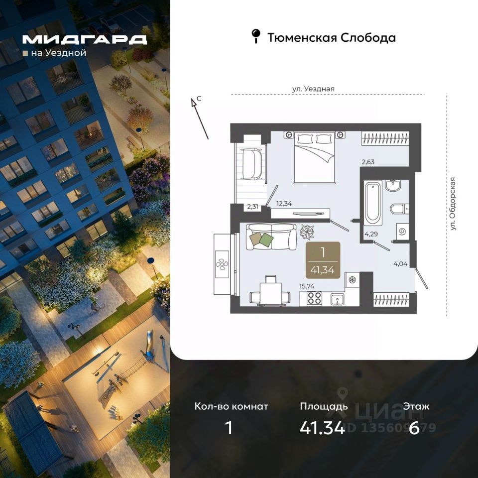 Однокомнатная квартира в ЖК ''Мидгард на Уездной'' на 6 этаже. Квартира без отделки, после получения ключей можно делать ремонт. Общая площадь: 41.34 кв.м., жилая: 12.34 кв.м., площадь просторной кухни-столовой: 15.74 кв.м. Все окна выходят на одну сторону. В квартире одна лоджия, один совмещенный санузел. Высота потолков 2.72 м.