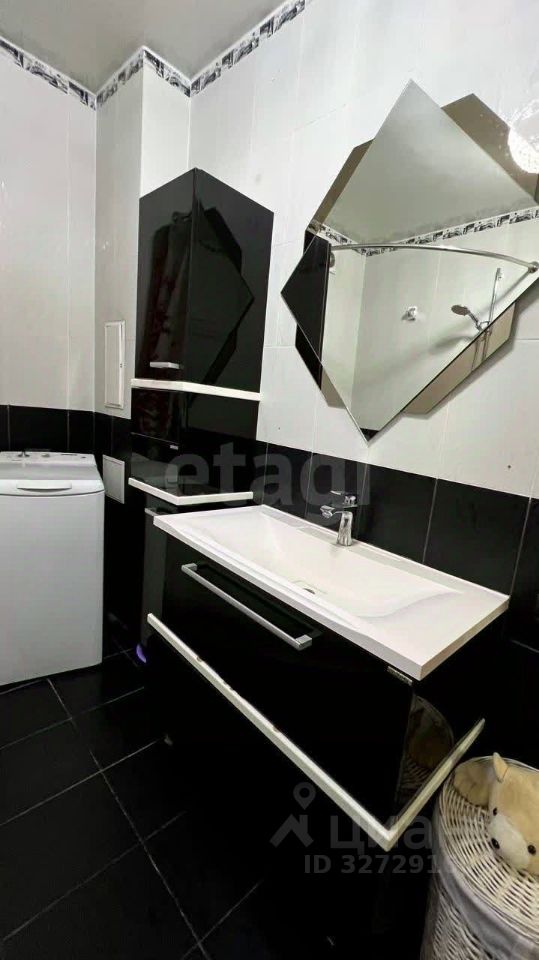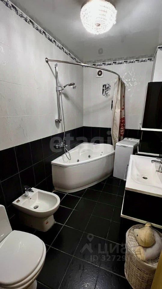 В ванной выполнен ремонт в черно-белых оттенках с французским шиком. Керамогранит, стиральная машина Воsсh, ванна-джакузи, биде, унитаз. Смесители Наnsgrоhе. Долговечные.