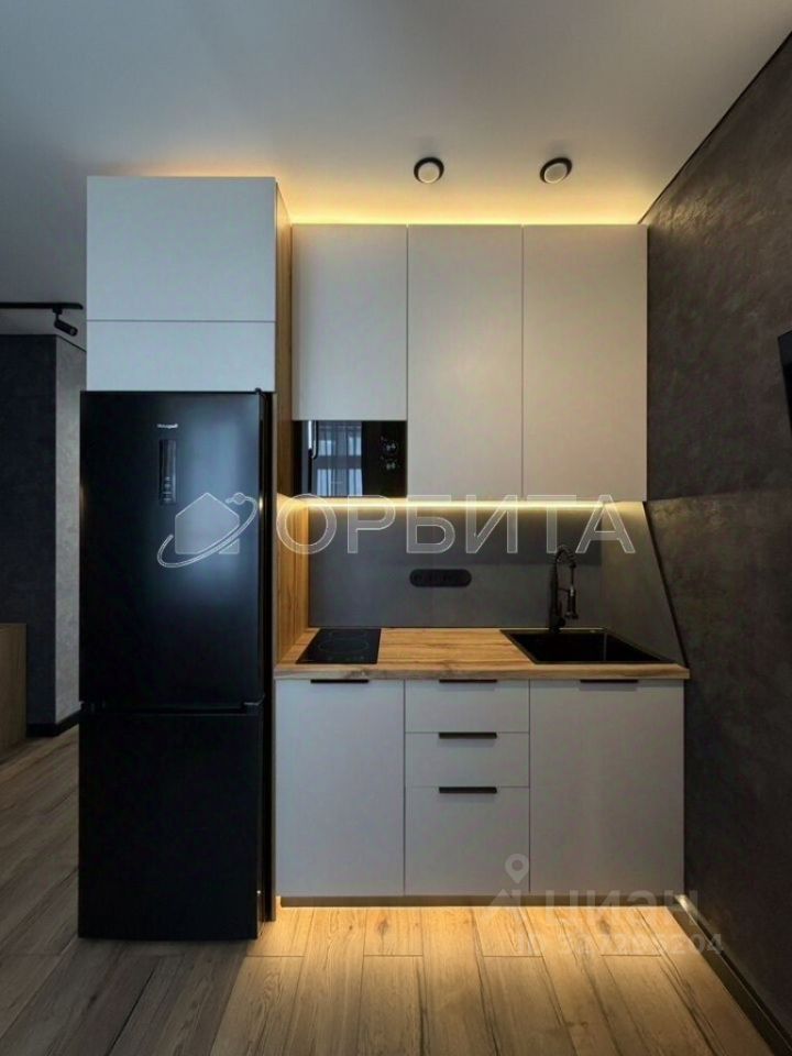 Современная кухня с качественной встроенной бытовой техникой и индивидуальным освещением.
