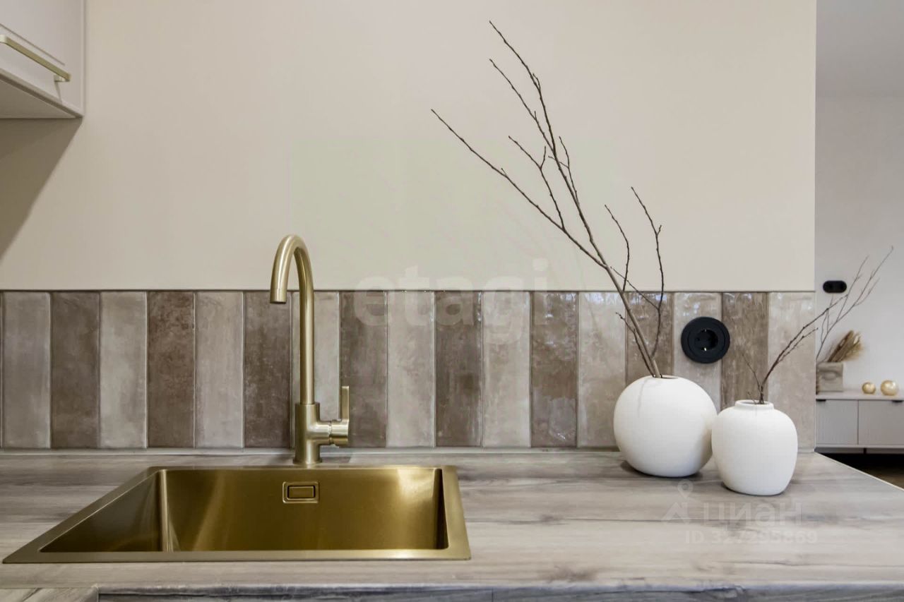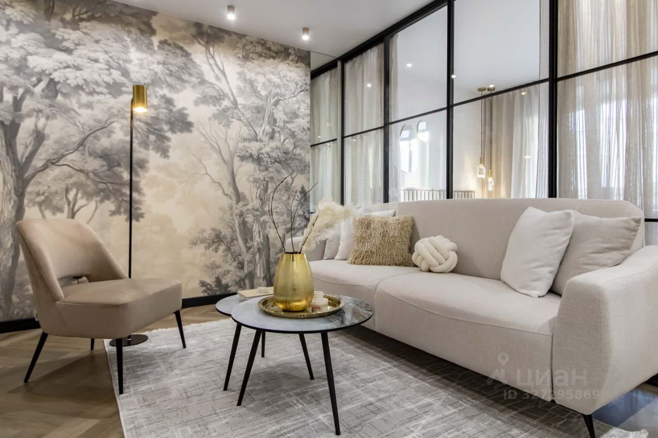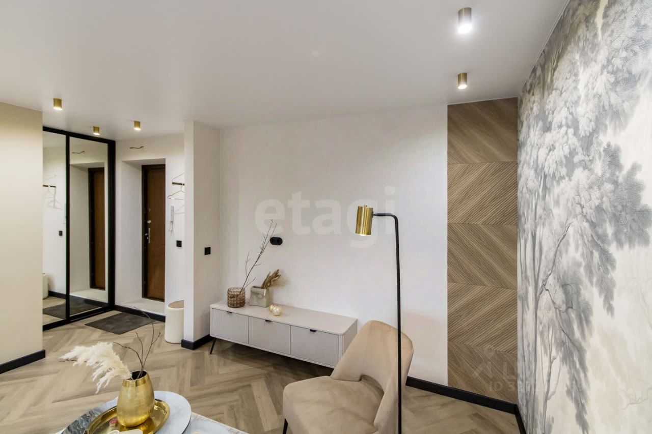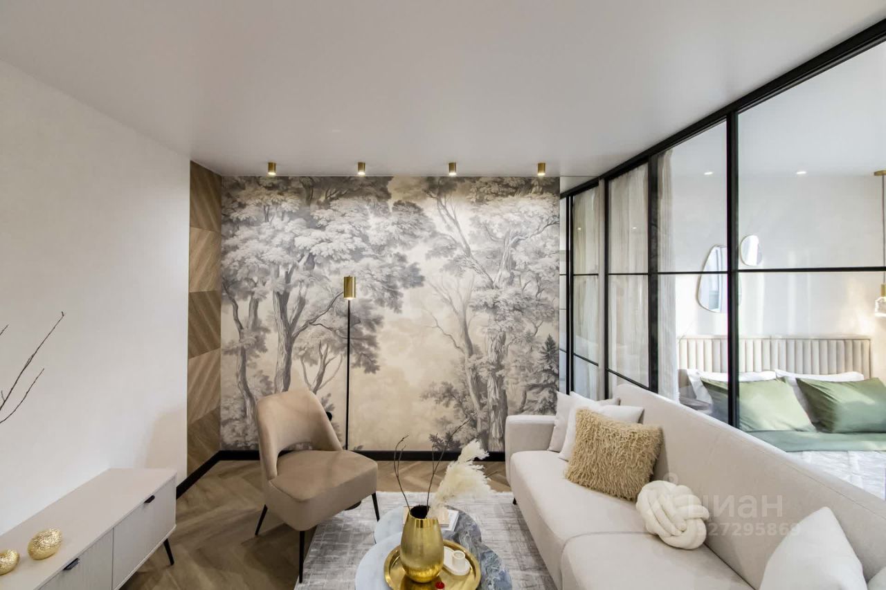 Главные преимущества: • Стиль и уют: Интерьер выполнен в приятной теплой светлой гамме. Квартира выглядит дорого и элегантно. • Детали интерьера: Изысканная золотая фурнитура, декоративные элементы (элегантные полоски) и эффектная фреска с пейзажем на стене создают неповторимую атмосферу.