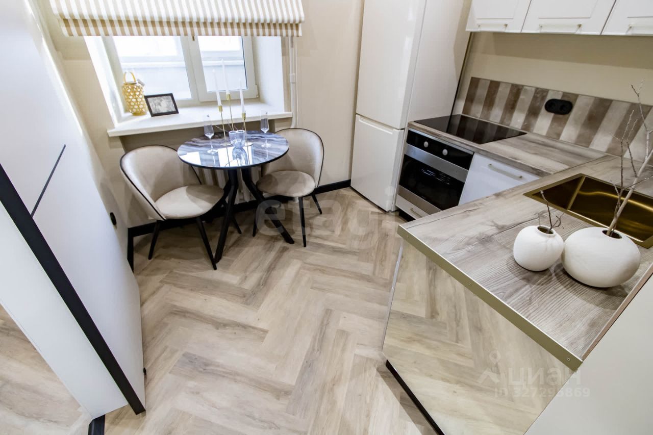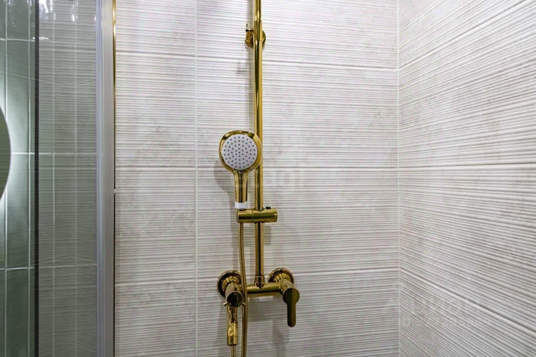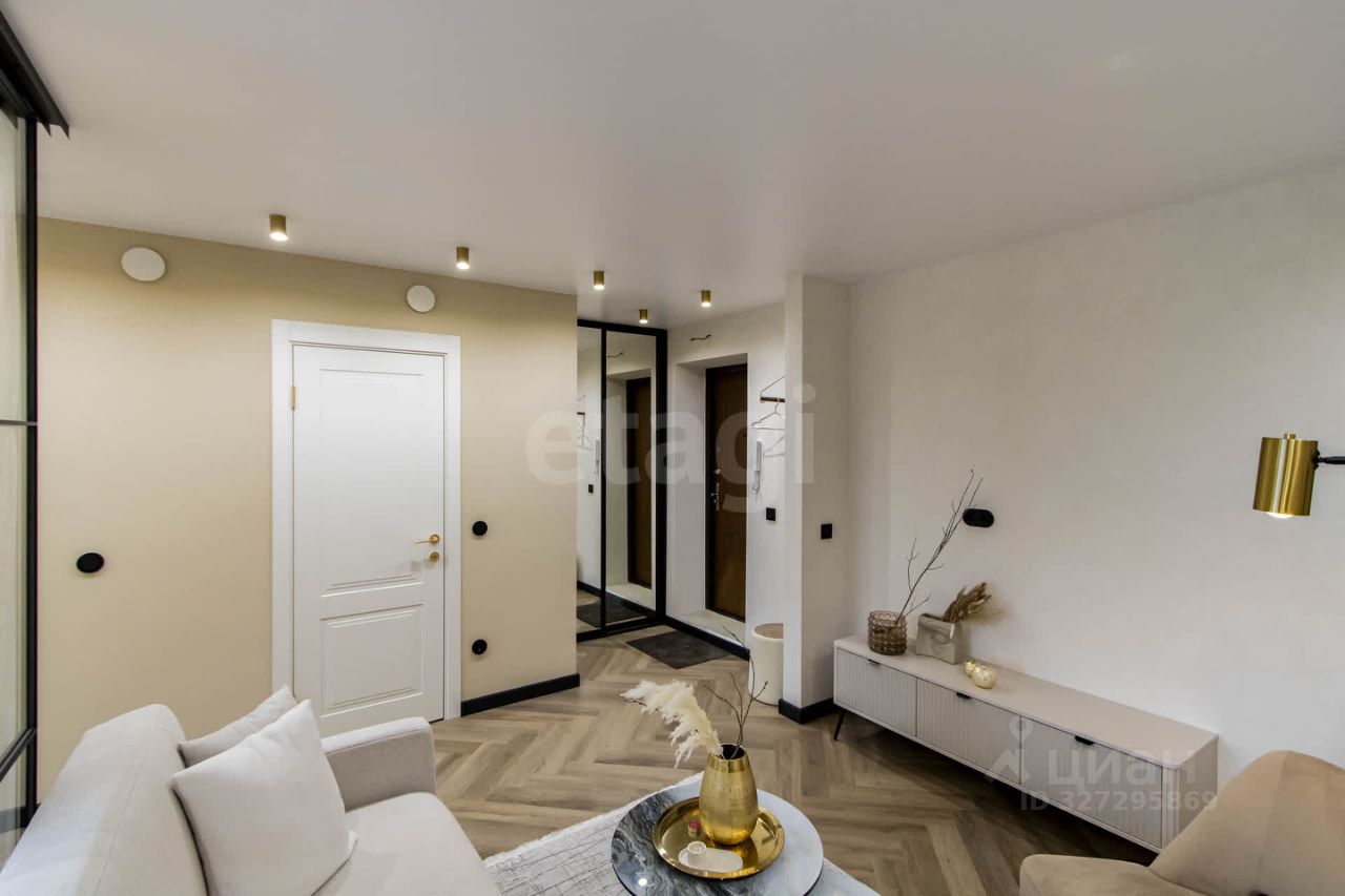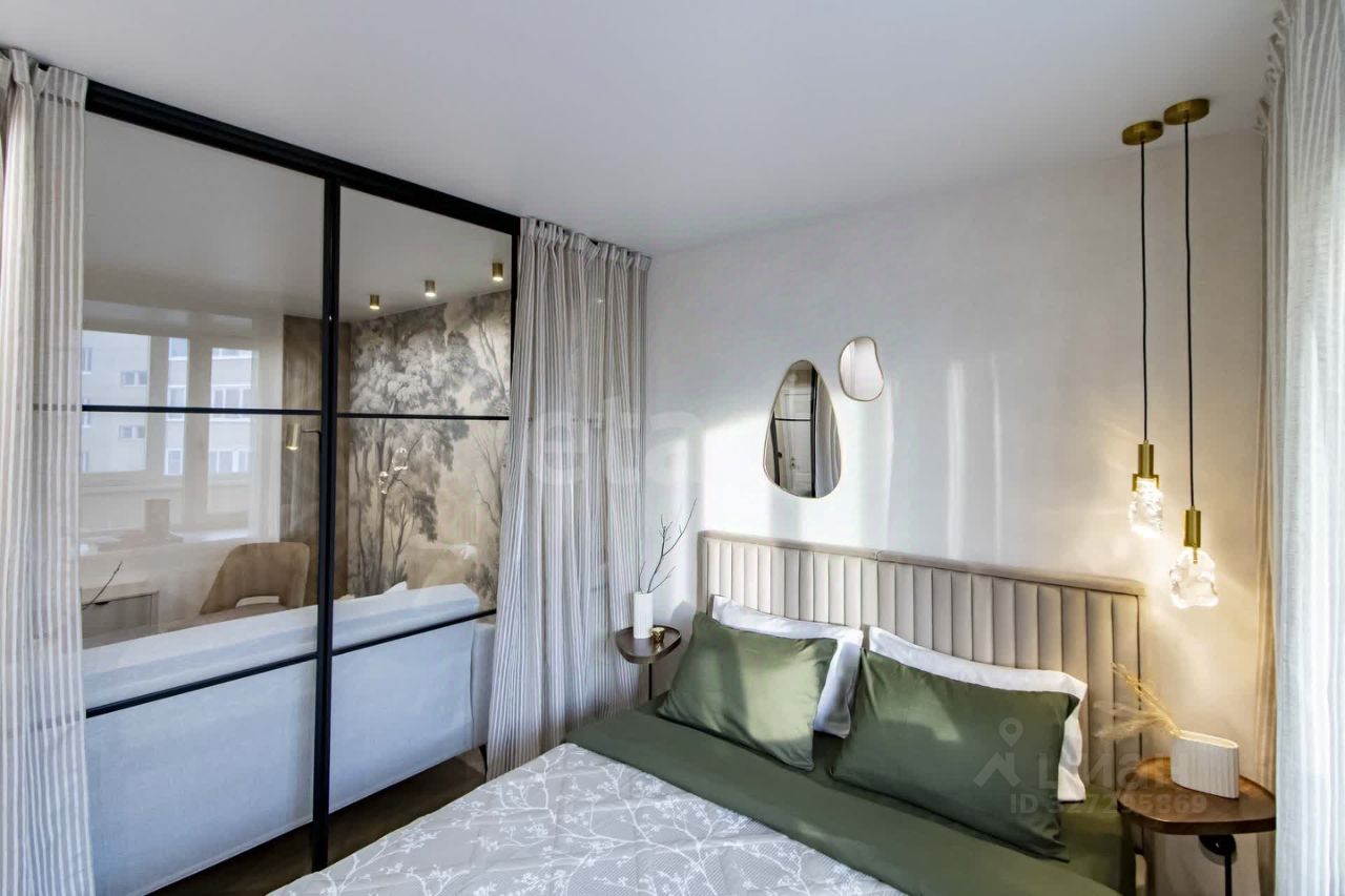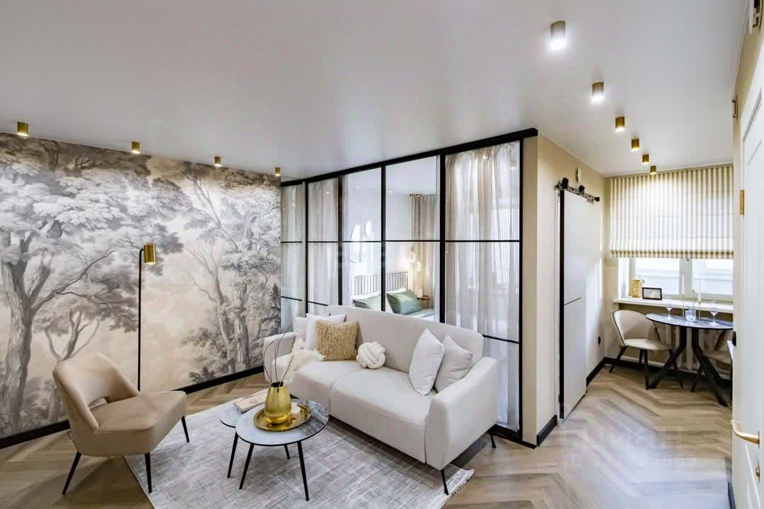 Главные преимущества: • Стиль и уют: Интерьер выполнен в приятной теплой светлой гамме. Квартира выглядит дорого и элегантно. • Детали интерьера: Изысканная золотая фурнитура, декоративные элементы (элегантные полоски) и эффектная фреска с пейзажем на стене создают неповторимую атмосферу.